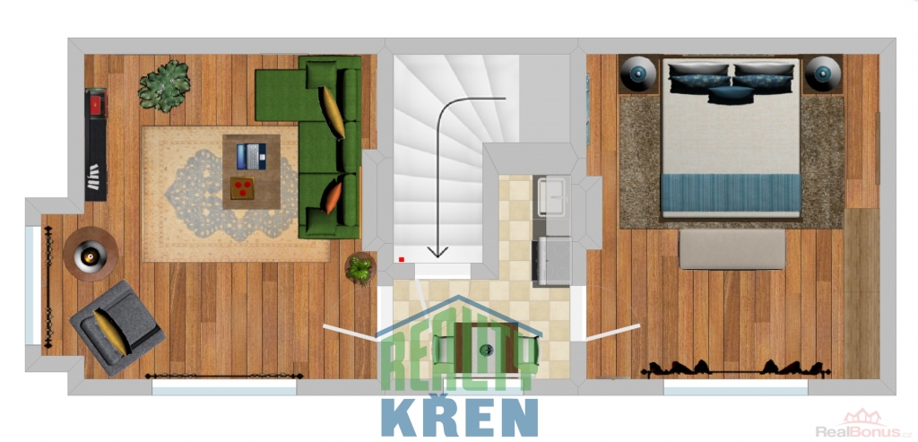 2. NP (43 m2): 2x pokoj, malá kuchyň;