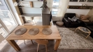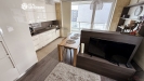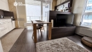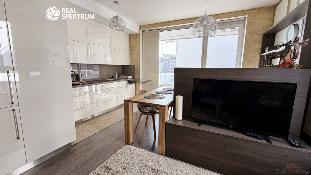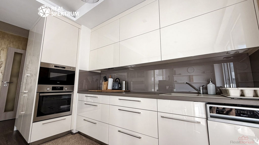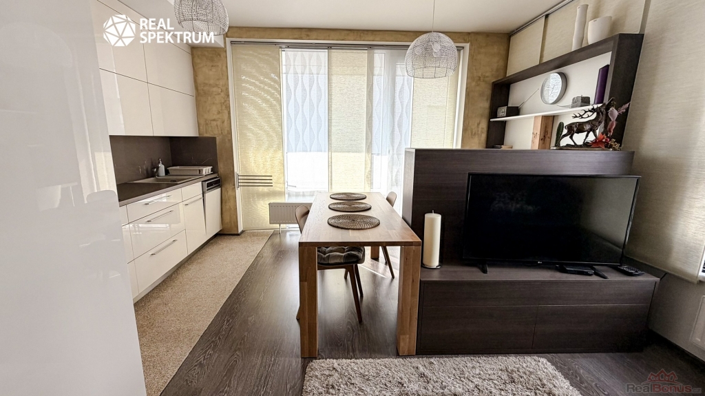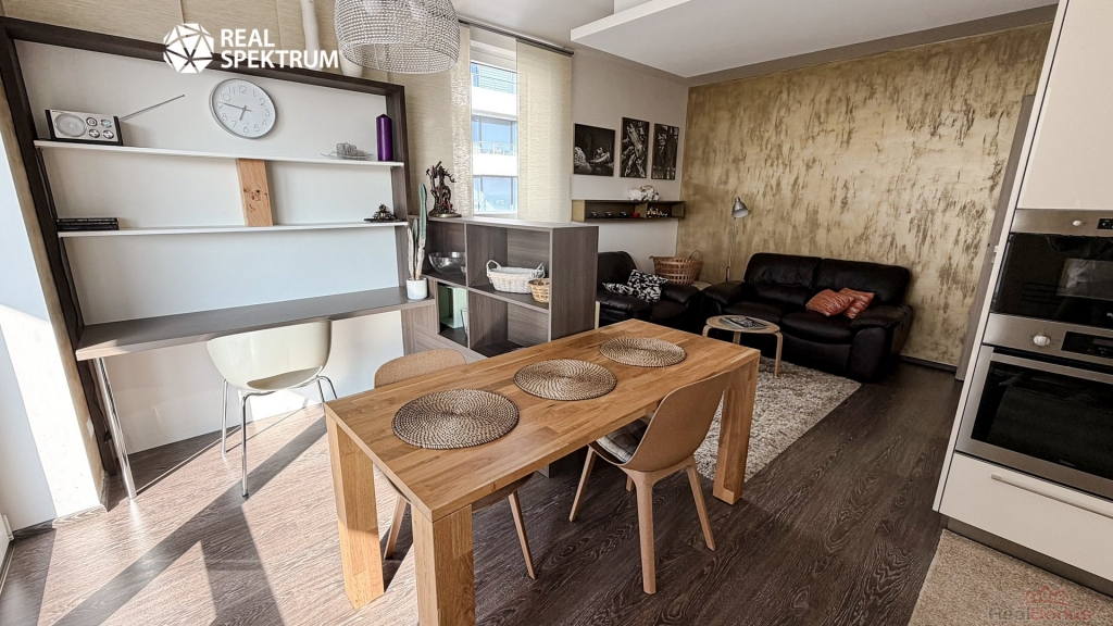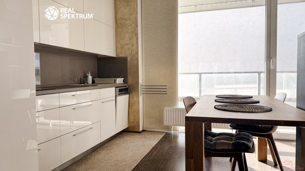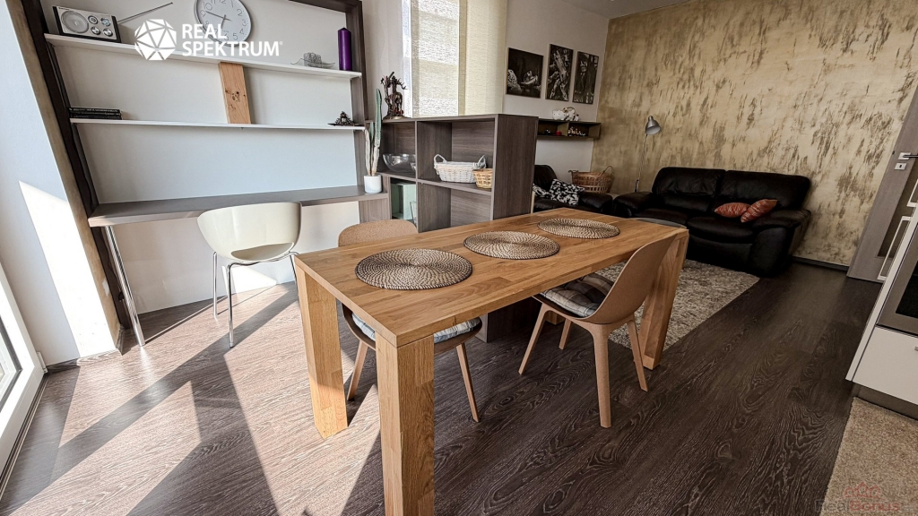 Obývací část s kuchyňským koutem tvoří přirozené centrum bytu. Moderní kuchyňská linka s vestavěnými spotřebiči navazuje na jídelní prostor i útulnou obývací zónu. Interiér je zařízen vkusně a nadčasově, s důrazem na jednoduchost a pohodlí. Praktickým bonusem je také pracovní kout vhodný pro práci z domova.