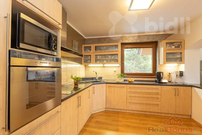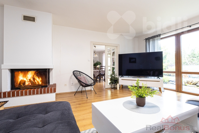 V přízemí se nachází moderní kuchyňská linka, propojená s jídelnou a prostorný obývací pokoj s krbem, který zajišťuje útulnou atmosféru i efektivní vytápění domu.