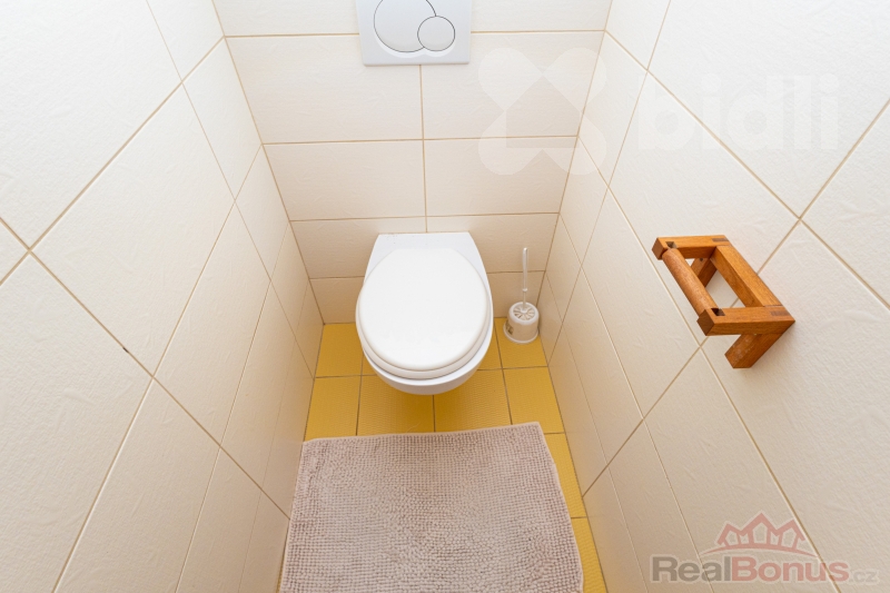 Dále je zde koupelna s vanou a sprchovým koutem, vybavená podlahovým vytápěním, a dvě samostatná WC.
