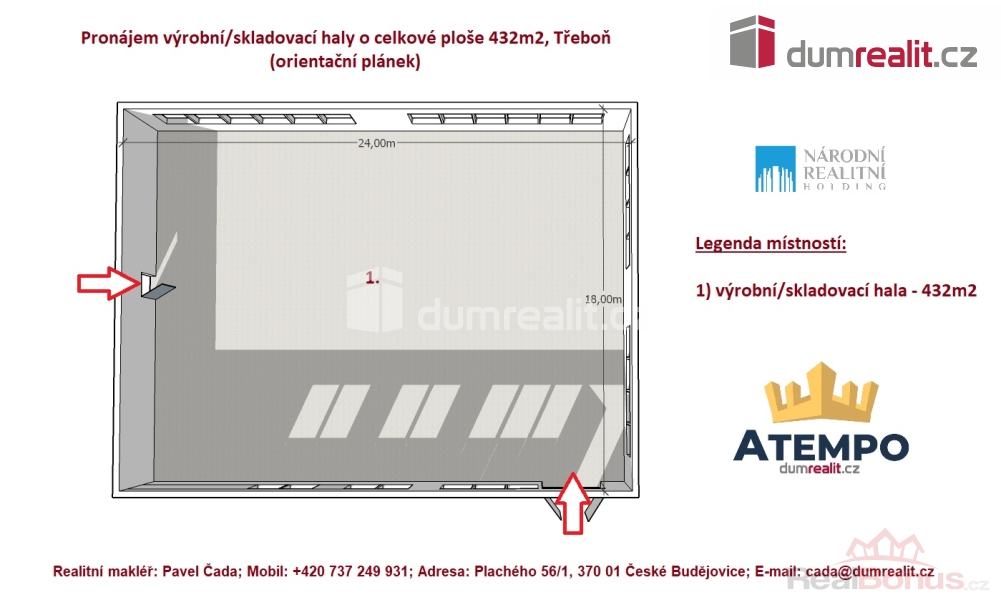 Více informací Vám poskytne realitní makléř Pavel Čada, Dumrealit.cz Vám zprostředkuje pronájem výrobních/skladovacích prostor s bezbariérovým přístupem, možností vykládek a nakládek kamionových souprav v areálu Otavan, Třeboň. Jedná se o temperovanou halu o celkové výměře 432m, kterou lze využít jako výrobní nebo skladovací prostory. Zároveň je možné si pronajmout venkovní oplocený prostor před logistickou halou o celkové výměře 400m. Dále k tomu nabízíme i možnost pronájmu kancelářského zázemí, šaten a stravovací místnosti o celkové výměře 80,5m. Veškeré prostory si lze pronajmout i samostatně pouze jako logistickou halu nebo kancelářské zázemí nebo jenom venkovní oplocený prostor. Nebytové komerční prostory se nachází v místě tranzitní křižovatky na Praha, Halámky/České Velenice - Rakousko, Jindřichův Hradec, České Budějovice. Energie jsou fakturovány dle spotřeby (7,- Kč bez DPH za kWh). Paušální poplatek 120,- Kč bez DPH/m/rok za celoroční připravenost areálu. NELZE skladovat hořlaviny a chemické látky. V místě pronájmu lze zřídit sídlo firmy. Areál se nachází 100m od železniční zastávky, 150m od stravovacího zařízení/jídelny. Více informací Vám poskytne realitní makléř Pavel Čada z realitní kanceláře A TEMPO s.r.o. fungující pod ochrannou známkou dumrealit.cz. Zajistíme Vám financování a veškerý právní servis. Těším se na prohlídce. Ev. číslo: 642576. Energetický štítek: G