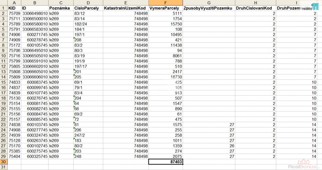 - lesní pozemek: 8 pozemků, celkem 4919 m