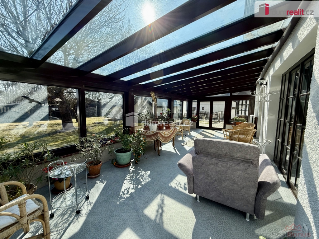 Na zahradě se nachází velmi prostorná venkovní beseda (barbecue zóna). K dispozici je dále objekt tvořící kryté parkovací stání pro osobní automobily. Z obývacího pokoje přístup do velkorysé zimní zahrady.