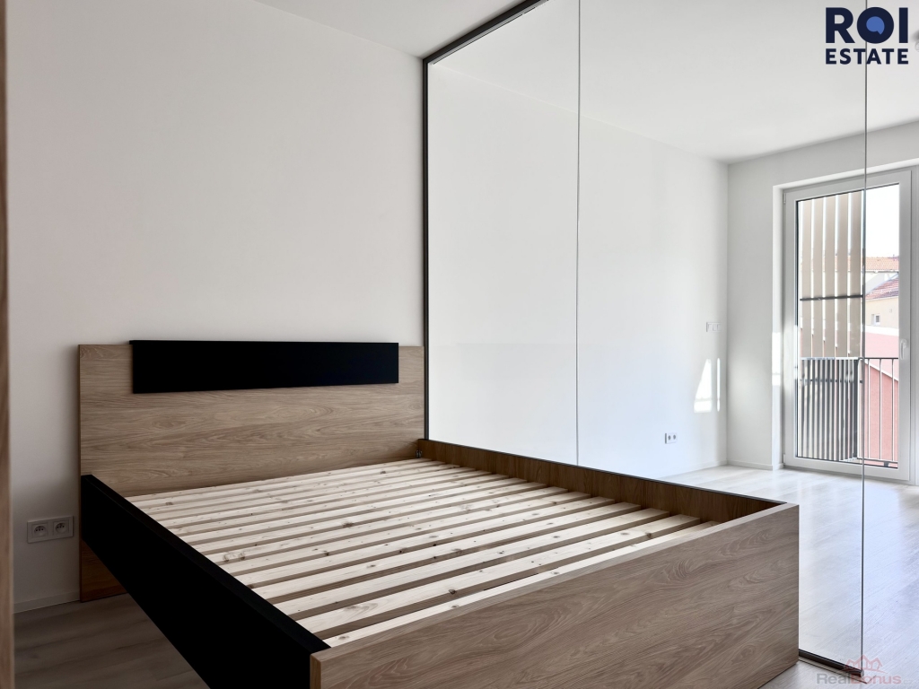 Interiér je moderní a vzdušný. Obytný prostor je chytře rozdělen elegantní skleněnou stěnou, která dodává bytu styl a zároveň zachovává dostatek světla. Kuchyňská linka je vyrobena na míru, je plně vybavena vestavěnými spotřebiči značky Electrolux ( trouba, indukční varná deska, digestoř, myčka), takže se můžete ihned.
