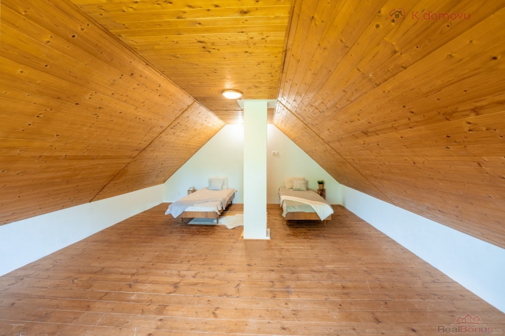 V přízemí je krásná obytná místnost s kuchyní a koupelna s toaletou, krbová kamna a vstup na slunnou terasu. V podkroví je velká otevřená místnost, kterou lze využít jako ložnici nebo pracovnu. Vytápění je dostatečné krbovými kamny a v koupelně je podlahové topení s termostatem, ohřev vody je vyřešen elektrickým bojlerem. Je zde nádrž na 2000 litrů pro užitkovou vodu, pitná voda zde není, kanalizace je řešena nádrží s trativodem. Chata má vlastní přípojku elektřiny. Přístup k objektu je po zpevněné komunikaci, parkování je zajištěno pro 2 auta přímo u chaty. Součástí prodeje jsou dva pozemky cca 700m2 + cca 2257m2 o celkové výměře 2 957 m2, jsou zde ovocné stromy jako jabloně, třešeň, švestky a další. Na protějším pozemku cca 700m2 se nachází obytná buňka do které je přivedena elektřina a lze ji po opravě využít jako dílnu, sklad, ateliér nebo další místo pro spaní. Nemovitost lze financovat hypotečním úvěrem, protože chata má evidenční číslo. Uvedená cena je včetně provize RK.