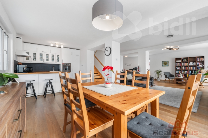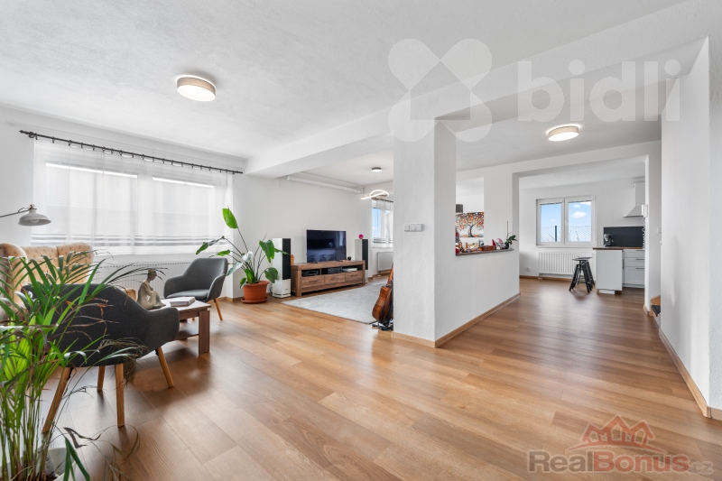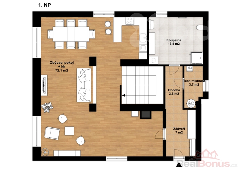 - vzdušný otevřený prostor obývacího pokoje s kuchyní a jídelnou (72 m2)