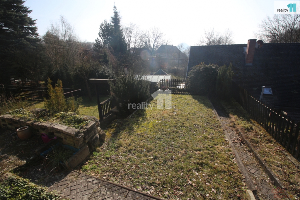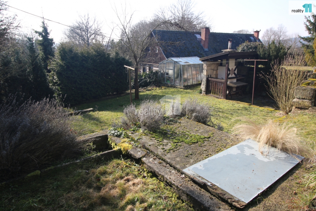 Zahrada je svažitá, jsou zde ovocné stromy a Ořešák (vlašské ořechy).