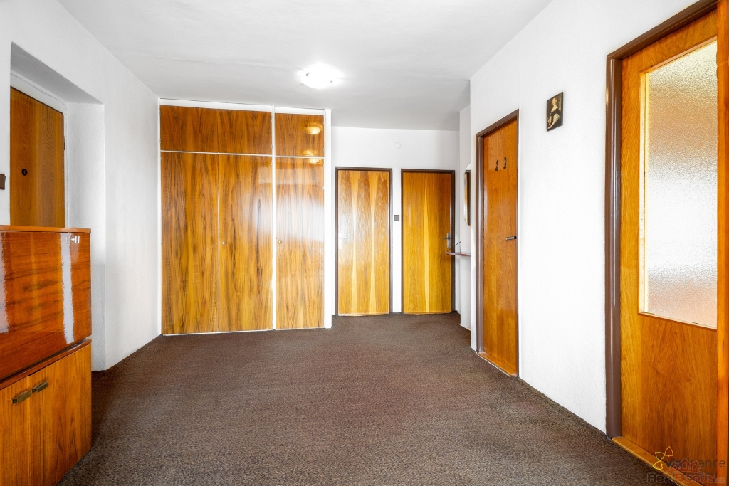 Z prostorné vstupní haly vejdeme do jednotlivých místností, pokoje jsou tedy neprůchozí. Byt je částečně vybavený - kuchyňská linka, trouba, lednice, šatní skříň v chodbě. Na podlaze jsou koberce.