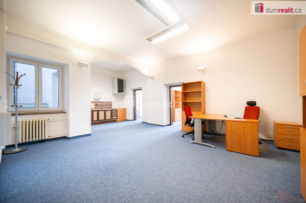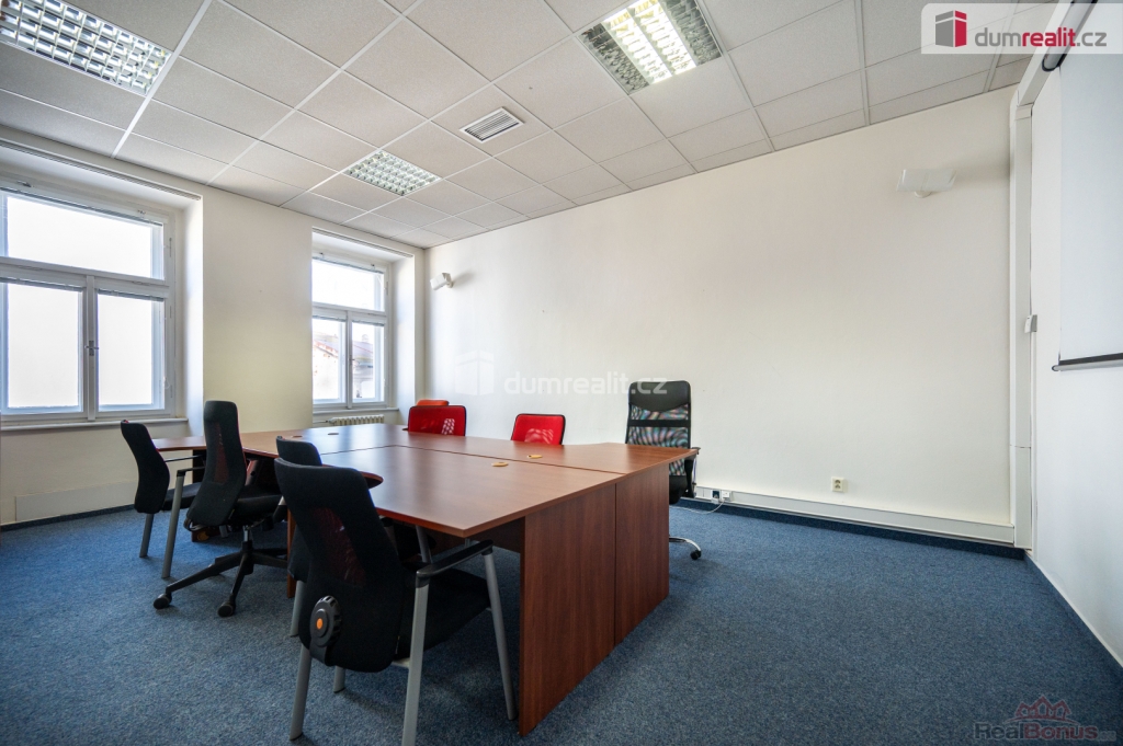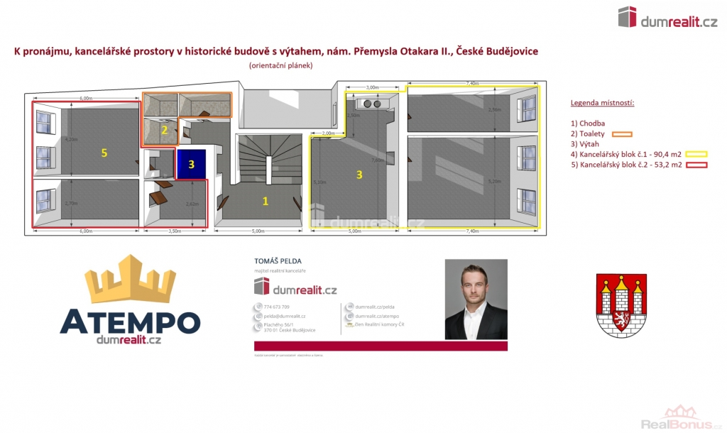 + poplatky za energie 6.500,- Kč/měsíc. Více informací Vám poskytne makléř Tomáš Pelda., Dumrealit.cz Vám zprostředkuje pronájem kanceláří o výměře 143 m na prestižní adrese na nám. Přemysla Otakara II č.p. 8 s výhledem na historické centrum města České Budějovice. Kanceláře se nachází ve 2. patře (3. NP) historického domu s výtahem. Prostory se pronajímají částečně vybavené (viz. fotografie) dle dohody. Dispozici kanceláří naleznete na orientačním plánku mezi fotografiemi. Náklady na provoz domu jsou ve výši cca 6.500,- Kč měsíčně dle využití, prostory mají podružné měření elektrické energie a vody. Vytápění je v domě plynové a rozúčtování se řeší dle podlahové plochy. Možnost pronájmu samostatných kancelářských bloků. Více informací Vám poskytne realitní makléř Tomáš Pelda z realitní kanceláře A TEMPO fungující pod ochrannou známkou dumrealit.cz. Ev. číslo: 650855. Energetický štítek: G