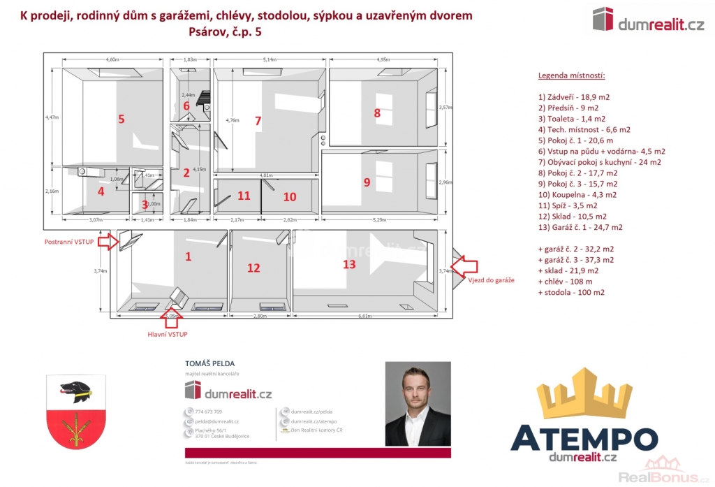 Cena je včetně provize RK a právního servisu. Více informací Vám poskytne makléř Tomáš Pelda, Dumrealit.cz Vám zprostředkuje prodej rodinného domu 4+kk v započaté rekonstrukci (nová střešní krytina) s garážemi, chlévy, sýpkou, stodolou, předzahrádkou a pozemkem v uzavřeném dvoře v obci Psárov, č.p. 5. Prodávaný rodinný dům je ze smíšeného zdiva a má dobrý základ s novou střešní krytinou, plastovými okny a nabízí variabilitu dispozičního uspořádání vzhledem k nosným a nenosným konstrukcím domu, možnost vytvoření podkroví na půdě. Dům je vytápěný kotlem na tuhá paliva a elektrokotlem. Ohřev teplé vody je elektrickým bojlerem. Objekt má vlastní studnu s pitnou vodou. Kanalizace je řešena septikem. Doporučuji prohlídku, na pozemku je dostatek staveb k vlastní realizaci. Možnost dokoupit další pozemky za domem a les. K dispozici máme kompletní pasportizaci stavby. Více informací Vám poskytne realitní makléř Tomáš Pelda z realitní kanceláře A TEMPO fungující pod ochrannou známkou dumrealit.cz. Ev. číslo: 653310. Energetický štítek: G
