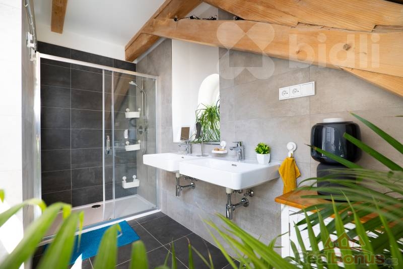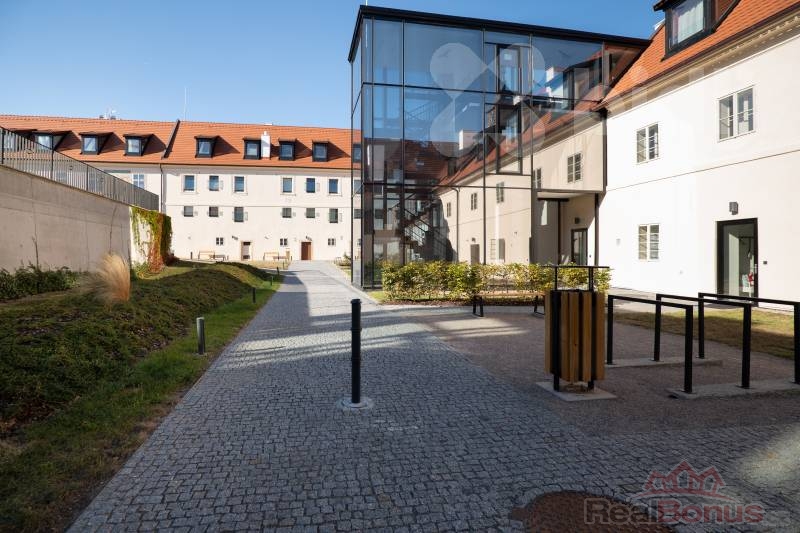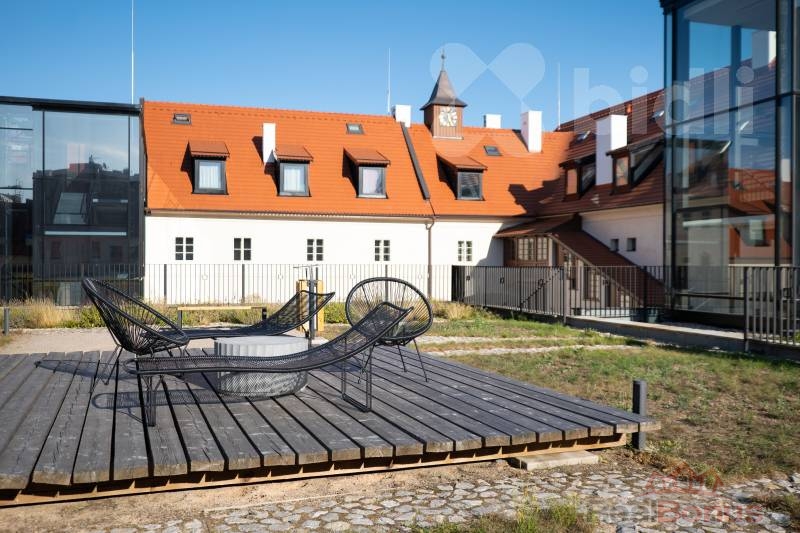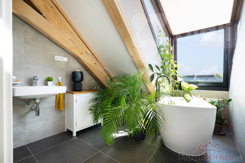 Atypický byt o rozloze 123,5 m2 v nejvyšším podlaží zaujme reprezentativní dispozicí 3+kk a nadstandardním provedením interiéru. Kuchyňská linka s deskou z přírodní žuly Nero Assoluto, americká lednice Samsung s výrobníkem ledu, vestavné spotřebiče (kompaktní a parní trouba, indukční deska) Samsung a myčka Electrolux vytvářejí harmonii elegance a funkčnosti. Designová koupelna s volně stojící vanou i prostorným sprchovým koutem podtrhuje atmosféru luxusního bydlení. Komfort umocňují tři klimatizační jednotky Toshiba.