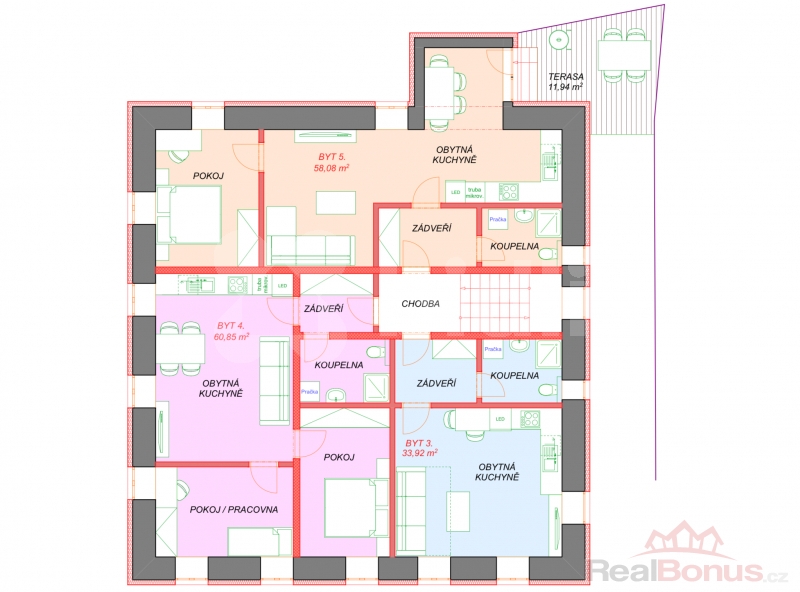 - 1. NP: 2 byty, technické zázemí, kolárna a společnými skladovacími prostory