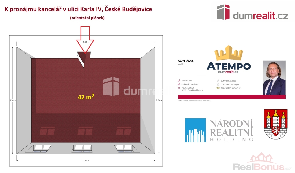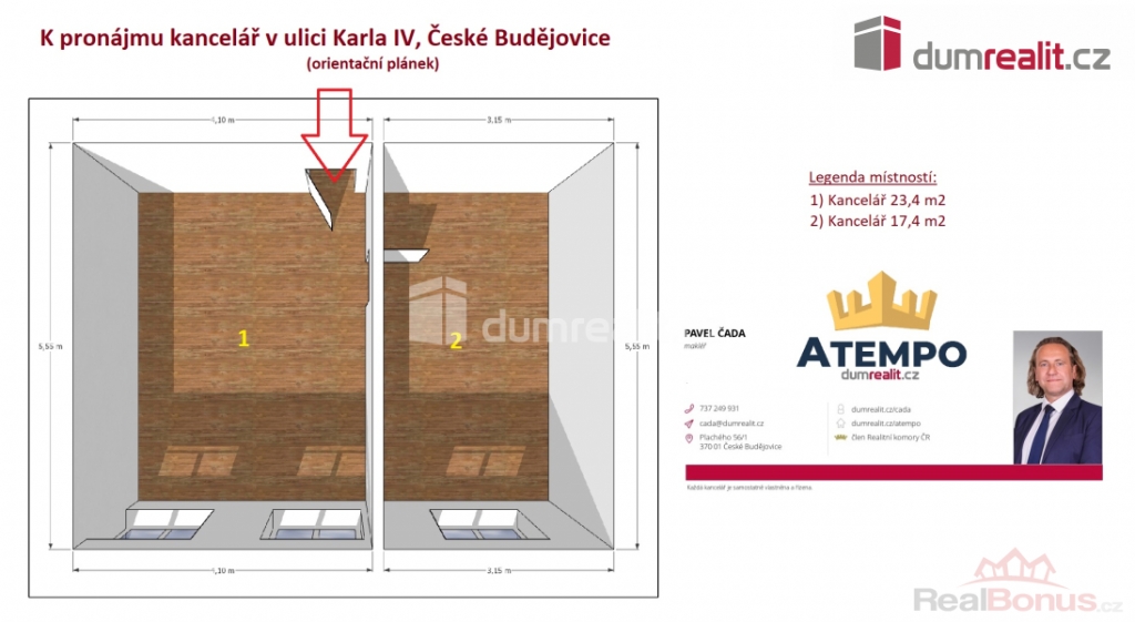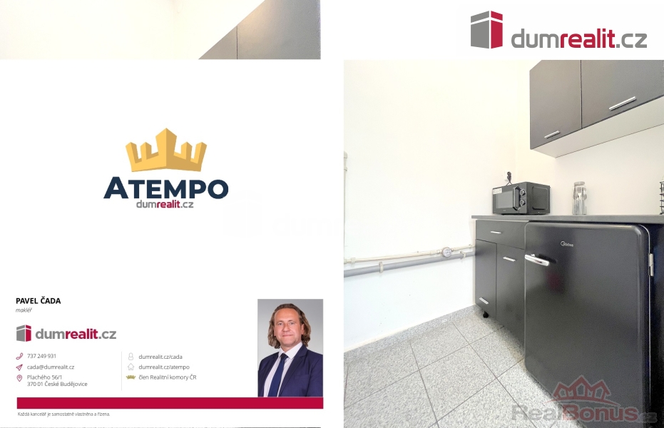 Více informací Vám poskytne realitní makléř Pavel Čada., Dumrealit.cz Vám zprostředkuje pronájem komerčních a kancelářských prostor s kuchyňkou a sociálním zázemím na exkluzivní adrese přímo v historickém centru města České Budějovice. Kancelářské prostory různých velikostí (24m až 46m) se nachází v rohovém domu na náměstí Přemysla Otakara II., České Budějovice. Jedná se o pronájem celkem 8 volných kanceláří, které je samozřejmě možné si pronajmout jednotlivě. Dispozice jednotlivých prostor naleznete ve fotogalerii. Zálohy na energie a služby nejsou v ceně pronájmu a jsou účtovány zvlášť dle velikosti pronajatých prostor. V místě pronájmu lze zřídit sídlo firmy/provozovnu. Více informací Vám poskytne realitní makléř Pavel Čada z RK A TEMPO fungující pod ochranou známkou dumrealit.cz. Ev. číslo: 644560. Energetický štítek: G