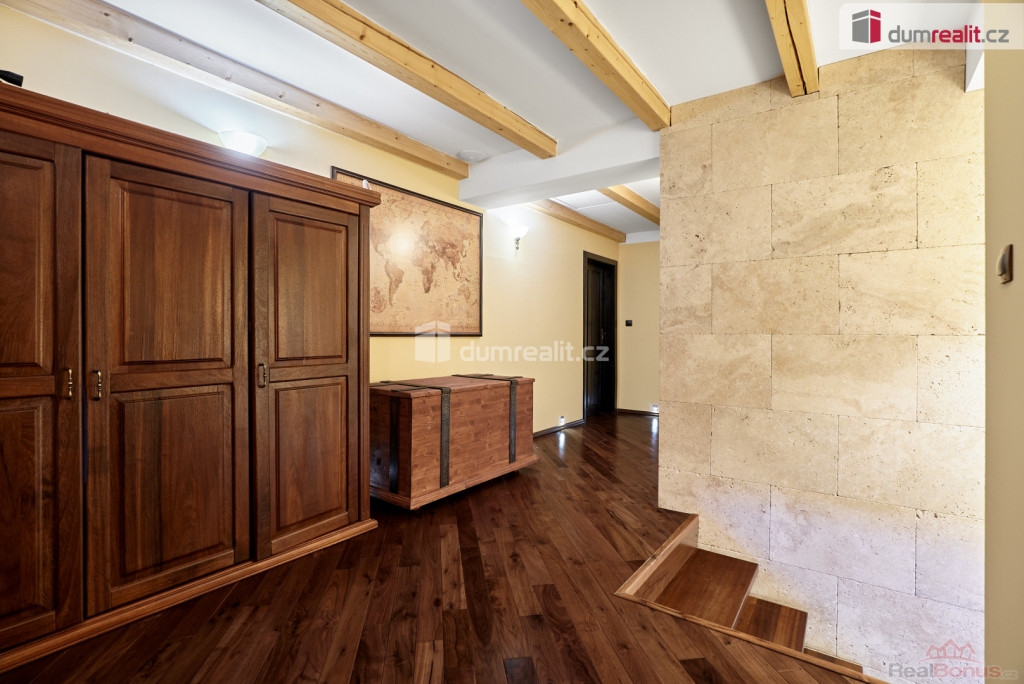 Součástí tohoto pozemku je rodinný dům o dispozici 4+kk. RD je zděný, částečně podsklepený, s podlahovou plochou 230 m. Dispozice domu zahrnuje prostorný obývací pokoj s krbovými kamny, kuchyň s kuchyňskou linkou na míru, jídelnu, 3 ložnice s vlastními koupelnami a WC. V přízemí je finská sauna vč. sprchy a odpočívárny, zimní zahrada s terasou a vstupem na zahradu. Dále je zde prostorná chodba vč. schodiště, zádveří, samostatné WC a technická místnost. Dům má velký půdní prostor (možnost vybudování další obytné místnosti). Vytápění domu a ohřev vody je zajištěn plynovým kotlem. Dům disponuje elektronickým zabezpečovacím systémem, finskou saunou, venkovní vířivkou a dalšími luxusními prvky. Po kompletní rekonstrukci, kdy byl kladen důraz na kvalitu použitých materiálů, provedení ale i vybavení domu, je dům připraven k okamžitému nastěhování bez dalších investic.