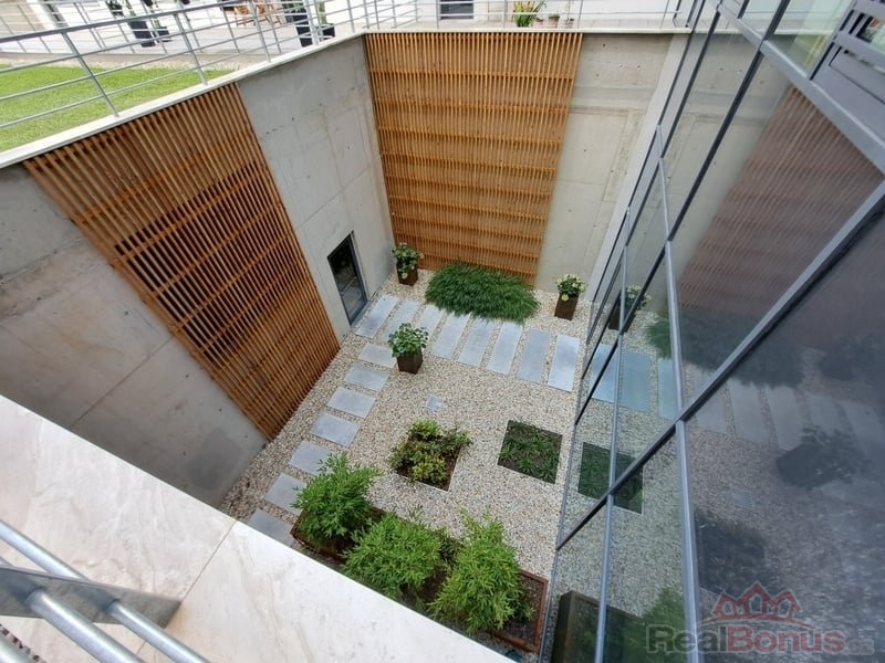 Součástí vybavení je rekuperační jednotka pro trvalý přísun čerstvého vzduchu, klimatizace pro komfortní chlazení i venkovní elektricky ovládané žaluzie. K bytu náleží také možnost využití kolárny.