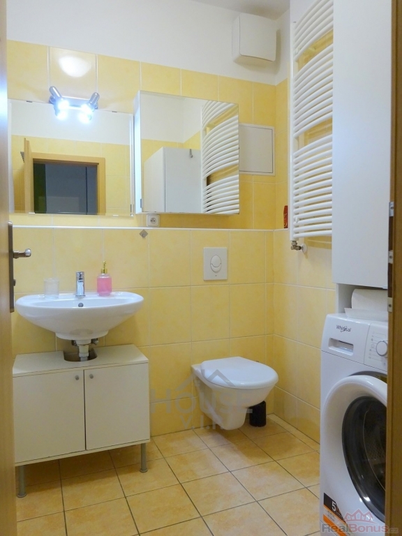 Kvalitní materiály, praktická skříň nad pračkou a celkově precizní úprava bytu vytvářejí harmonické a funkční bydlení. Podlahy tvoří kombinace PVC a dlažby, plastová okna směřují do klidného vnitrobloku.