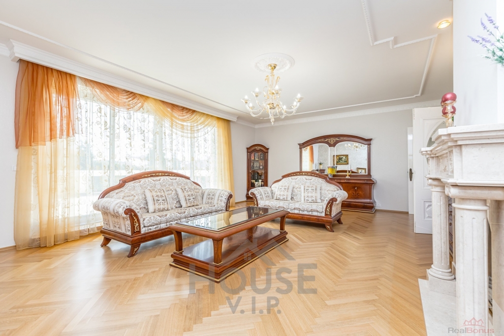 V prvním patře se nachází velký světlý obývací pokoj s architektonickým mramorovým krbem a italským nábytkem. Z obývacího pokoje je přístup na velkou terasu.