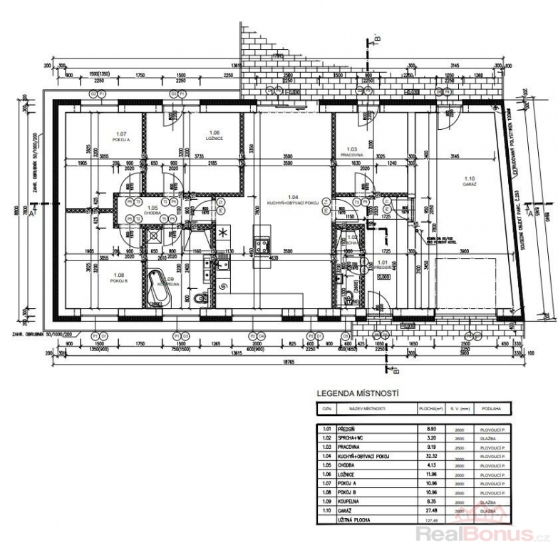 garáž s vraty na dálkové ovládání 27,48 m2 s umyvadlem/výlevkou a přípravou na pračku a sušičku, předsíň 8,93 m2, 1. koupelna s WC, umyvadlem a sprchovým koutem 3,20 m2, pracovna/šatna 9,19 m2, obývací pokoj s kuchyňským koutem 32,32 m2, chodba 4,13 m2, ložnice 11,96 m2, pokoj 10,96 m2, pokoj 10,96 m2, 2. koupelna s WC, vanou, sprchovým koutem a dvojumyvadlem 8,35 m2.