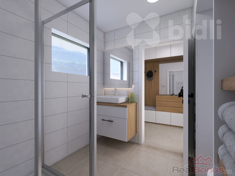 Novostavba nízkoenergetického mezonetového bytu o dispozici 3+KK a podlahové ploše 85,5 m2, v provedení montované dřevostavby (v rámci projektu je možné zvolit i byt ve zděné variantě). Byt je součástí trojdomu - tedy domu se třemi samostatnými jednotkami. Svým uspořádáním připomíná spíše řadový rodinný dům, ideální pro moderní a úsporné bydlení. V přízemí se nachází prostorný obývací pokoj s kuchyňským koutem, koupelna a zádveří. V patře pak najdete ložnici, další pokoj, druhou koupelnu a chodbu. K bytu náleží také snadno udržovatelná zahrada o rozloze 243 m2, která nabízí prostor pro relaxaci i volnočasové aktivity. Ke každé bytové jednotce náleží 1 parkovací stání.