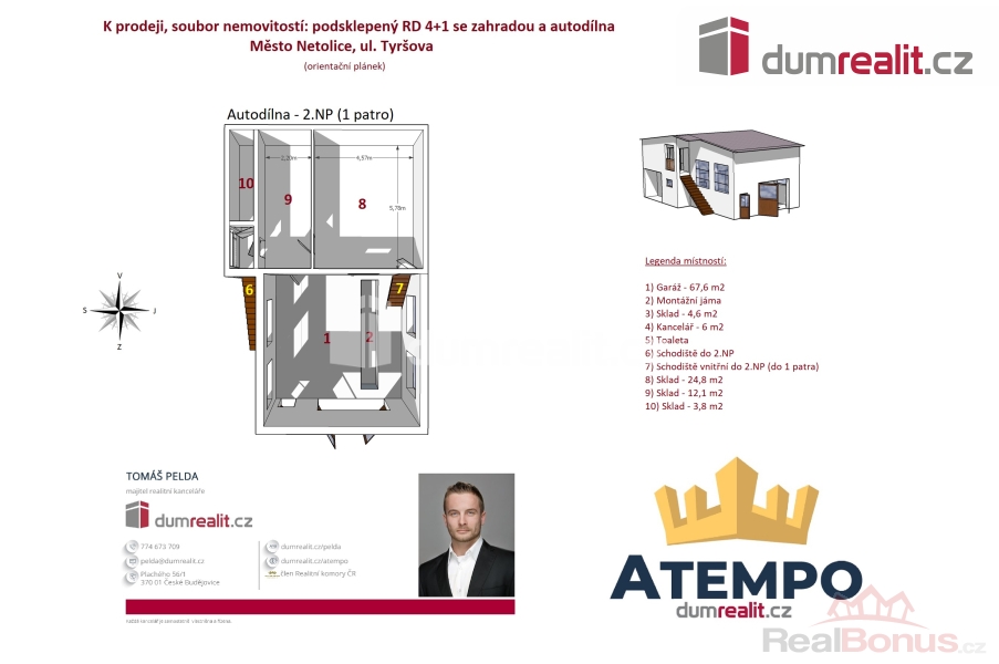 Cena je včetně provize RK a právního servisu. Více informací Vám poskytne makléř Tomáš Pelda., Dumrealit.cz Vám zprostředkuje koupi souboru nemovitostí na jednom místě v klidné lokalitě, a to ve městě Netolice v ul. Tyršova: 1) poctivě postavený podsklepený zděný rodinný dům 4+1 s pergolou, bazénem, skleníkem a udržovanou zahradou; 2) AUTODÍLNA se zdviží, montážní jámou, sociálním zázemím, sklady a zpevněnými plochy na parkování. 1) RD je zděný a je připraven k okamžitému nastěhování. Dispozici jednotlivých podlaží a objektů naleznete na orientačním plánku mezi fotografiemi. Dům je variabilní, stejně tak i AUTODÍLNA, kterou lze zrekonstruovat na obytné prostory. RD má železobetonový strop mezi suterénem a 1.NP. Strop mezi 1.NP a půdou je zateplený dřevěný. Krov ve výborném stavu je pobitý prkny s eternitovými šablonami bez jakéhokoliv nedostatku a zatékání. Okna jsou dřevěná s dvojskly. Vchodové dveře jsou původní dřevěné. Garážová vrata v RD jsou automatická. Vytápění RD je kombinované s otopnou soustavou se "samotížkou": A) plynový kotel; B) kotel na tuhá paliva; C) kachlová kamna s výměníkem; D) vamberecká elektrická kachlová kamna. RD je napojen na plyn, elektřinu, městskou kanalizaci a veřejný vodovod + vlastní studna a darling. 2) AUTODÍLNA: zděný objekt s dřevěnými manuálními vraty, původní dřevěné vchodové dveře. Vybavení autodílny na fotografiích je součástí prodeje. Více informací o nabízených nemovitostech Vám poskytne realitní makléř Tomáš Pelda z realitní kanceláře A TEMPO fungující pod ochrannou známkou dumrealit.cz. Zajistíme Vám financování a veškerý právní servis. Ev. číslo: 652259. Energetický štítek: G