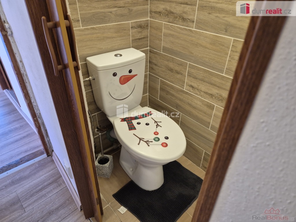 V přízemí nalezneme byt 2+1 s koupelnou se sprchovým koutem, umyvadlem a WC, a kotelnu s moderním kotlem na tuhá paliva. Po dřevěném schodišti se pak dostaneme do bytu o dispozici 3+1+úložný prostor s koupelnou s vanou a umyvadlem a samostatným WC, o cca 90 m podlahové plochy.