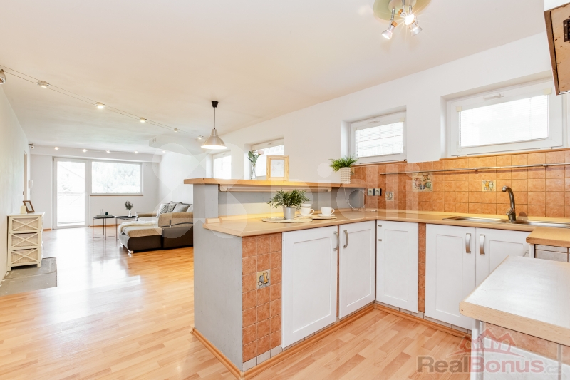 V 1. nadzemním podlaží se nachází byt 4kk (cca 90 m2): vstupní prostor, obývací pokoj s kuchyňským koutem, dětský pokoj, pracovna, ložnice a koupelna s WC a bidetem.