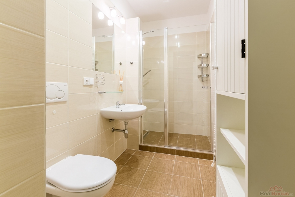Koupelna je osazená prostorným sprchovým koutem, keramickým umyvadlem a toaletou