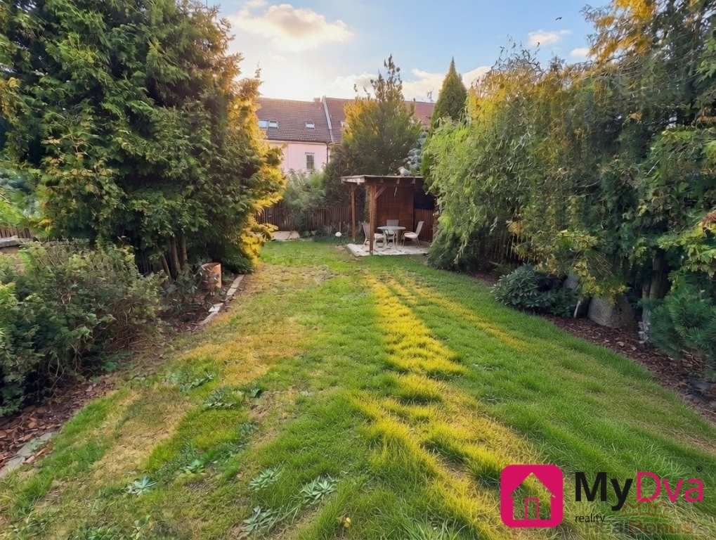 Za domem najdete udržovanou zahradu o ploše 124 m2 s terasou, markýzou a zahradním domkem na nářadí ? ideální prostor pro relax i rodinné grilování. Před domem jsou dvě parkovací stání a vjezd do garáže s automatickými vraty.