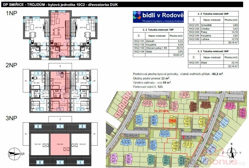 V rámci X. etapy developerského projektu Bidli v Rodově, Vám nabízíme moderní nízkoenergetický byt 3+kk, o celkové ploše 108,2 m2 (bytová jednotka 86,2 m2 + půdní prostor 22 m2), s předzahrádkou cca 88 m2,v malebné obci Smiřice, část Rodov, nedaleko od Hradce Králové. Byty jsou budovány v rámci trojdomů, tj. domů se třemi jednotkami, čímž je zaručen dostatek soukromí. Jednotky jsou situovány vedle sebe a řešeny jako mezonetové. Každý byt bude mít vlastní fotovoltaickou elektrárnu na výrobu elektrické energie pro ohřev teplé vody. Díky nízkoenergetické konstrukci a vlastní fotovoltaické elektrárně bude náklad na elektrickou energii (tj. vytápění, osvětlení, vaření a ohřev teplé vody) v bytě velmi nízký.