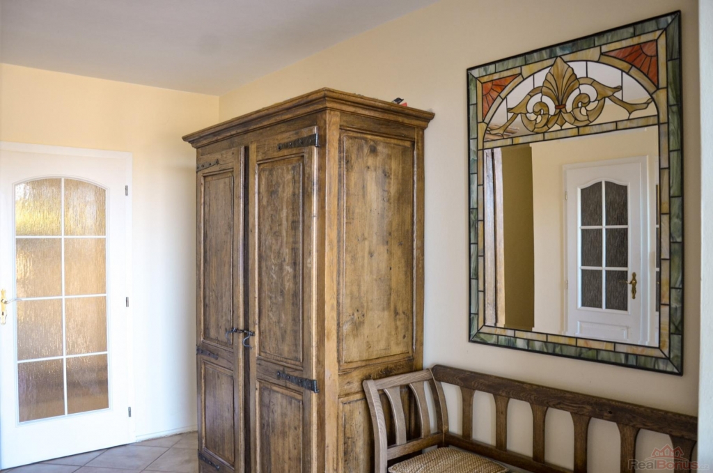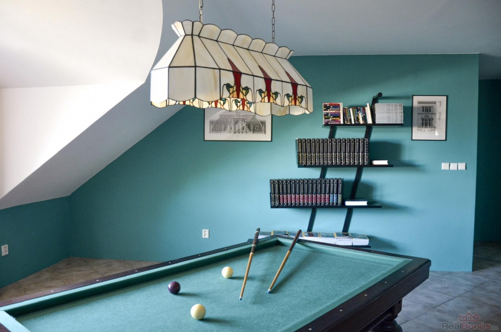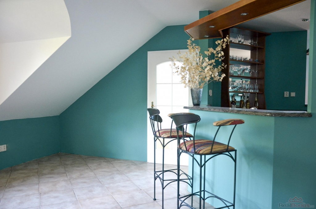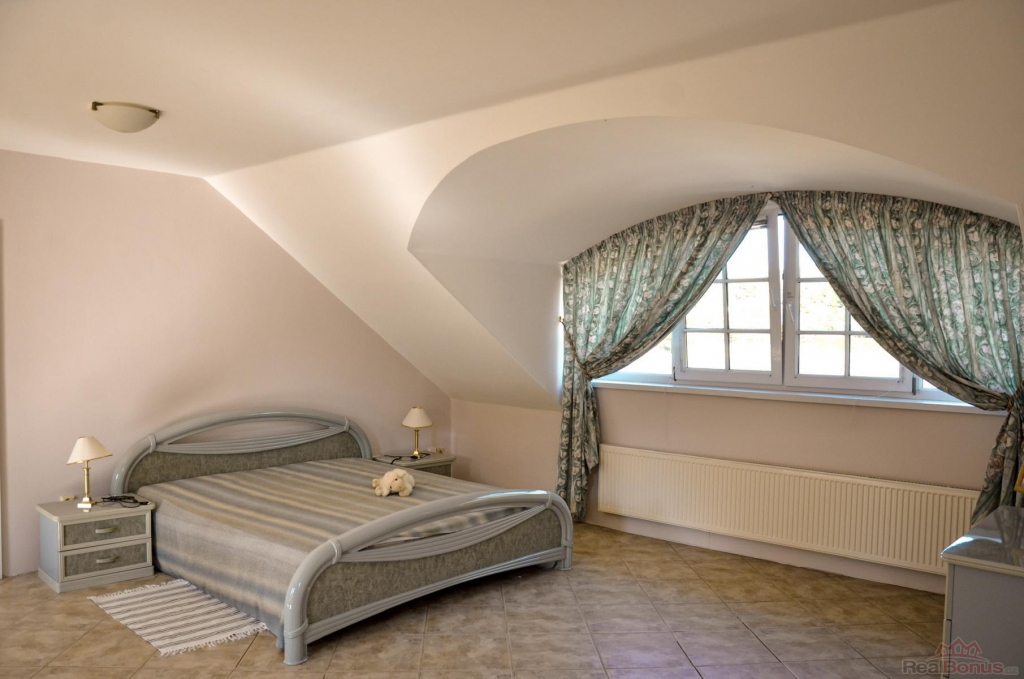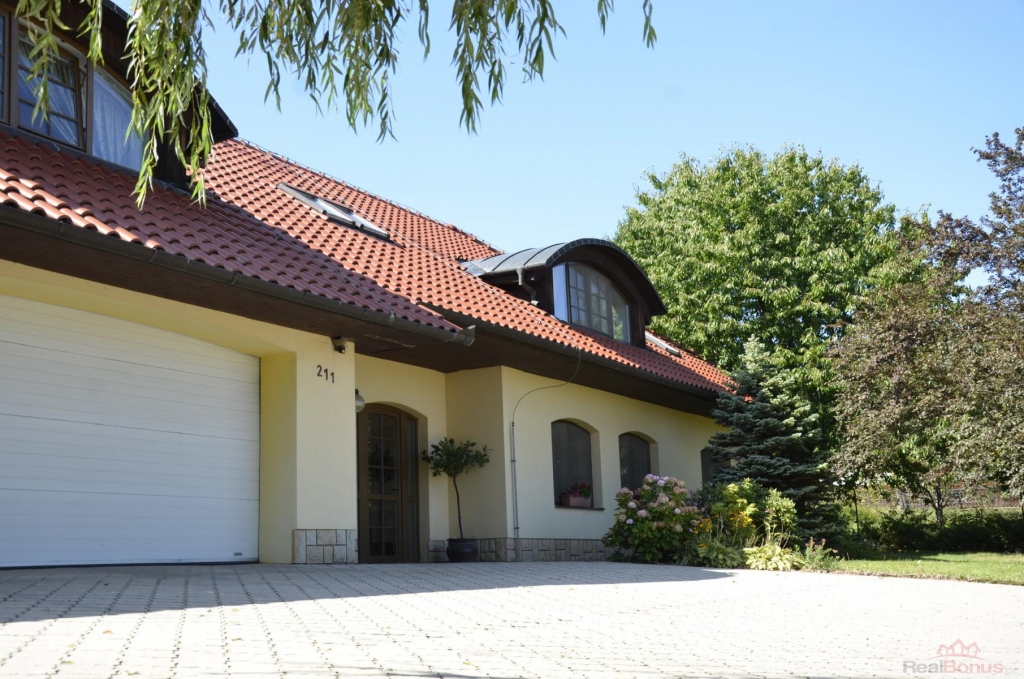Vířivé vany v koupelnách, příprava na saunu, kondenzační plynový kotel, garážová vrata a brána na dálkové ovládání.