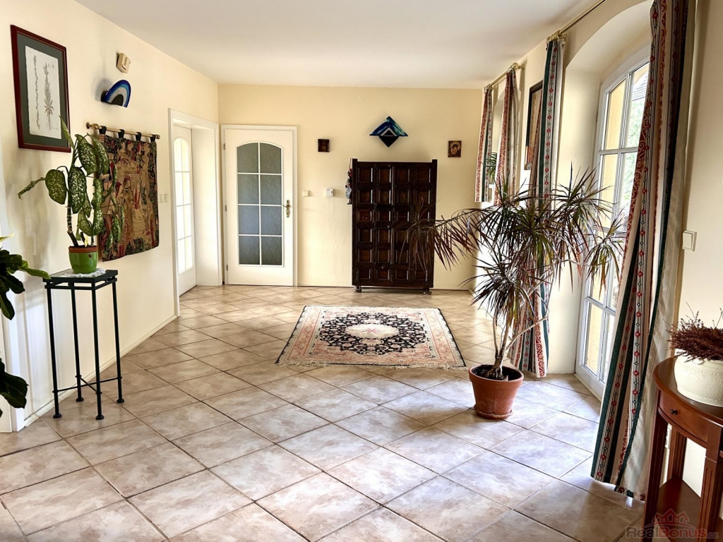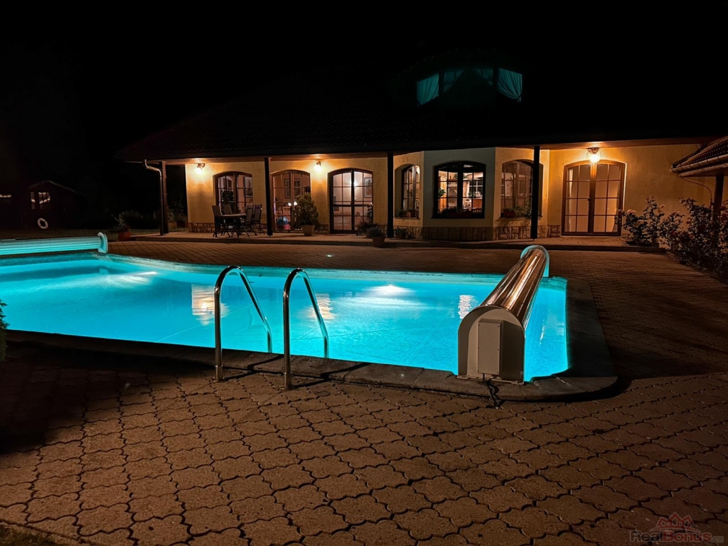 Najdete zde vyhřívaný bazén 12 × 5,5 m s lamelovým zakrytím, automatické zavlažování a zahradní osvětlení.