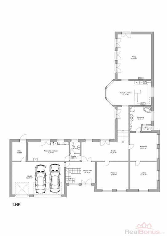 Součástí je garáž pro tři vozy, dílna a dostatek parkovacích míst pro návštěvy.
