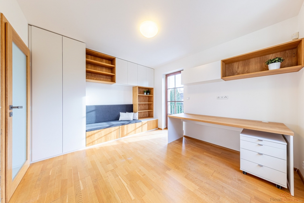 V 2.NP se nachází velká ložnice s šatnou propojenou s prostornou koupelnou se sprchovým koutem a toaletou. Dále je zde pracovna s vestavěnou knihovnou a pracovním místem, pokoj bez vybavení, pokoj s vestavěným nábytkem, druhá koupelna s vanou, toaletou a prostorem pro pračku se sušičkou. Na chodbě se pak nachází vestavěná šatní skříň.