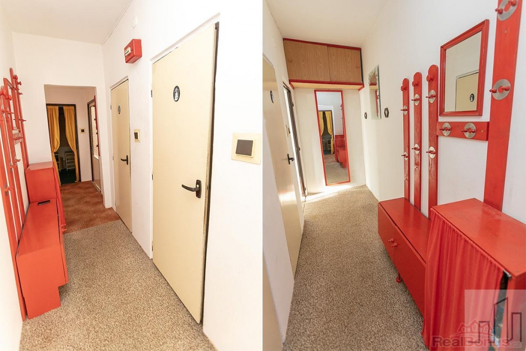 Po vstupu do bytu se ocitnete v prostorné chodbě, jejíž součástí je praktická šatna vhodná jako úložný prostor. Přímo naproti vstupu se nachází prostorná ložnice. Chodba dále pokračuje doprava, kde je umístěna samostatná toaleta a koupelna. Po levé straně se nachází kuchyně s kuchyňskou linkou a jídelním stolem. Součástí kuchyně je také praktická skříň sloužící jako špajz. Z kuchyně je vstup do prostorného obývacího pokoje. K bytu náleží sklepní kóje.