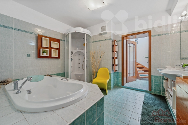 Po schodišti se dostanete do klidové části bytu. Najdete zde prostornou koupelnu s vanou, dvěma umyvadly, masážním sprchovým koutem a přístupem do technické místnosti s druhým WC, pračkou, sušičkou, umyvadlem a klimatizací. Ložnice má vlastní šatnu a rovněž klimatizaci. Velká okna přinášejí krásný výhled i dostatek denního světla, okna v ložnici jsou navíc vybavena elektronickými předokenními žaluziemi. Dětský pokoj je světlý a útulný. Chodba disponuje vestavěnými skříněmi.