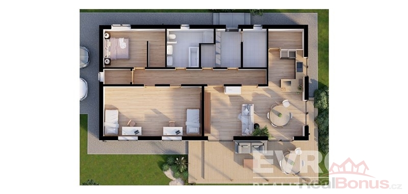 Cena zahrnuje kompletně dokončený a zkolaudovaný dům včetně terénních úprav, zámková dlažba, terasa, parkování a plot, podlahy, obklady a dlažby včetně sanity, masivní dveře a parapety.
