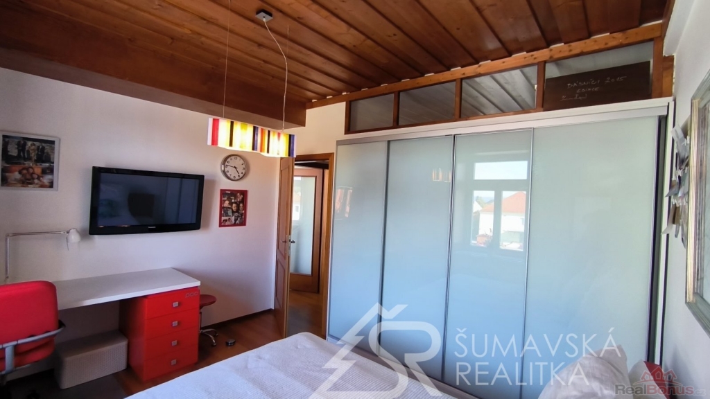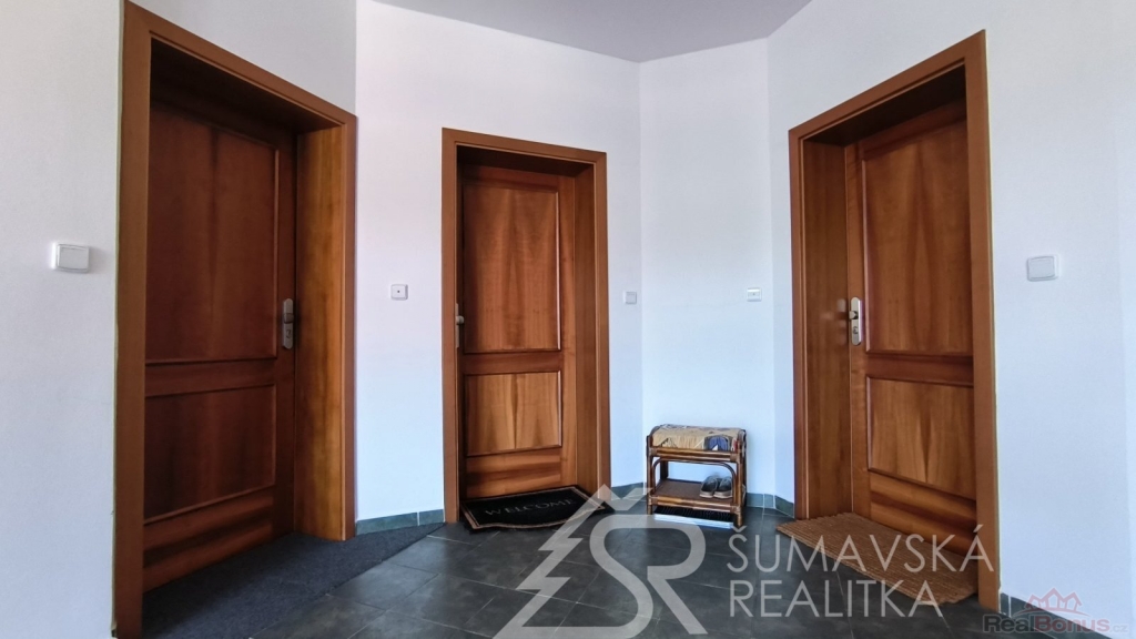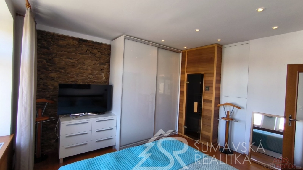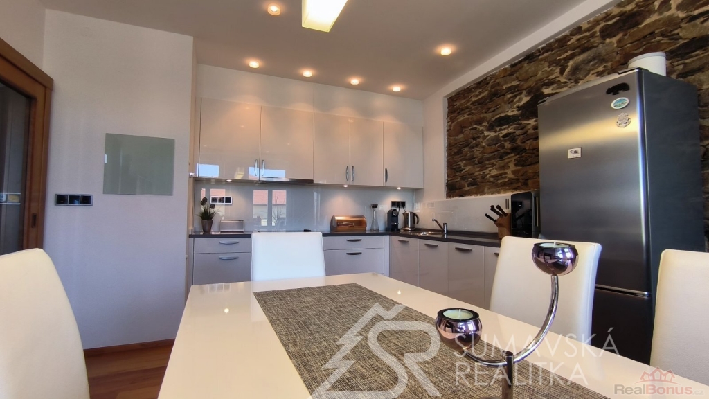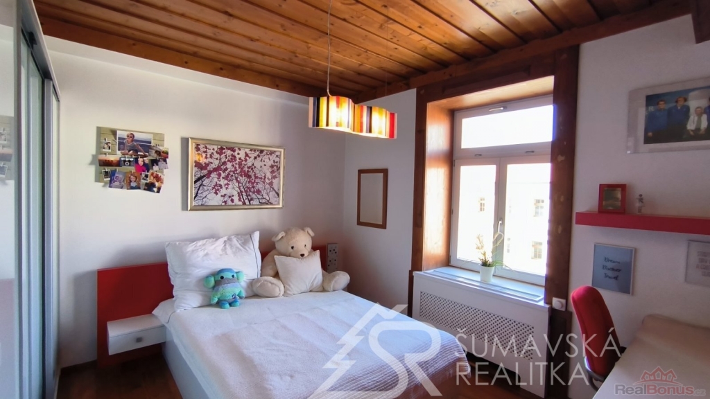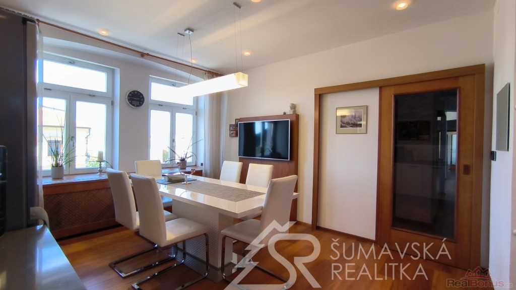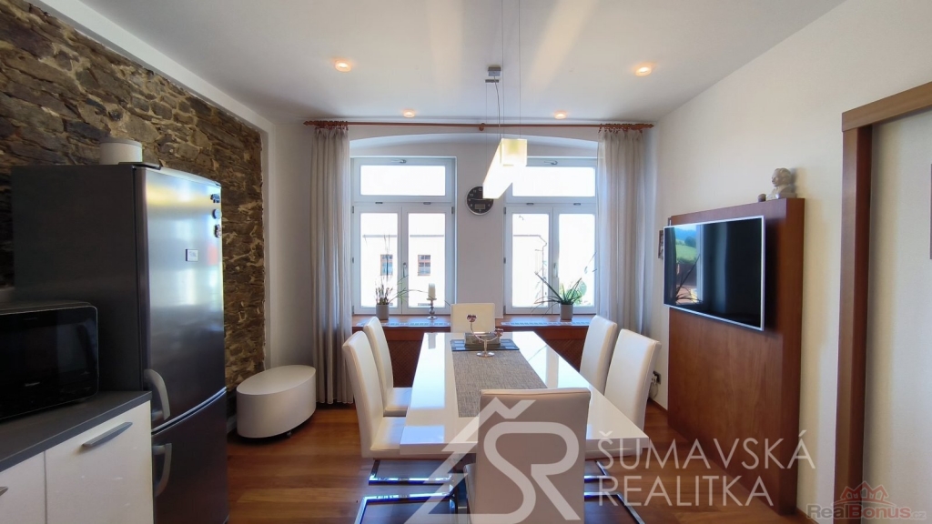 Přímo na gotickém náměstí v Kašperských Horách se nachází zrekonstruovaný dům v jehož 2.NP je nabízený apartmán o podlahové ploše 120 m2, který vznikl spojením dvou sousedních bytů. Nádherný výhled na námětí s kostelem sv.Markéty a radnicí je opravdu nezapomenutelný a neokoukatelný. Byt prošel kompletní modernizací v roce 2020, je nadčasově designově zařízen a v tomto stavu se také prodává. V prostorné předsíni jsou velkorysé vestavěné zrcadlové skříně a vstupy dveřmi z masivu do třech ložnic, obývacího pokoje, kuchyně s jídelnou a dvou koupelen s mramorovým obkladem. Ve větší ložnici je umístěna i infrasauna. Na jedné stěně v kuchyni je zachovalé původní kamenné zdivo, které dodává místnosti punc historie. Vybavení však hovoří o moderní době, kdy zařizovací předměty jsou od firmy Siemens (sklokeramický sporák, vestavěná trouba, digestoř) a myčka Bosch. Krásné jsou i dřevěné kryty radiátorů a velkoformátové dřevěné parkety z teaku v obytných místnostech. Veškerý nábytek byl tvořen na míru. V jedné z koupelen je vířivá vana a bidet. K bytu jsou k dispozici na chodbě dvě samostatné praktické komory a ve vnitřním dvoře parkovací stání.