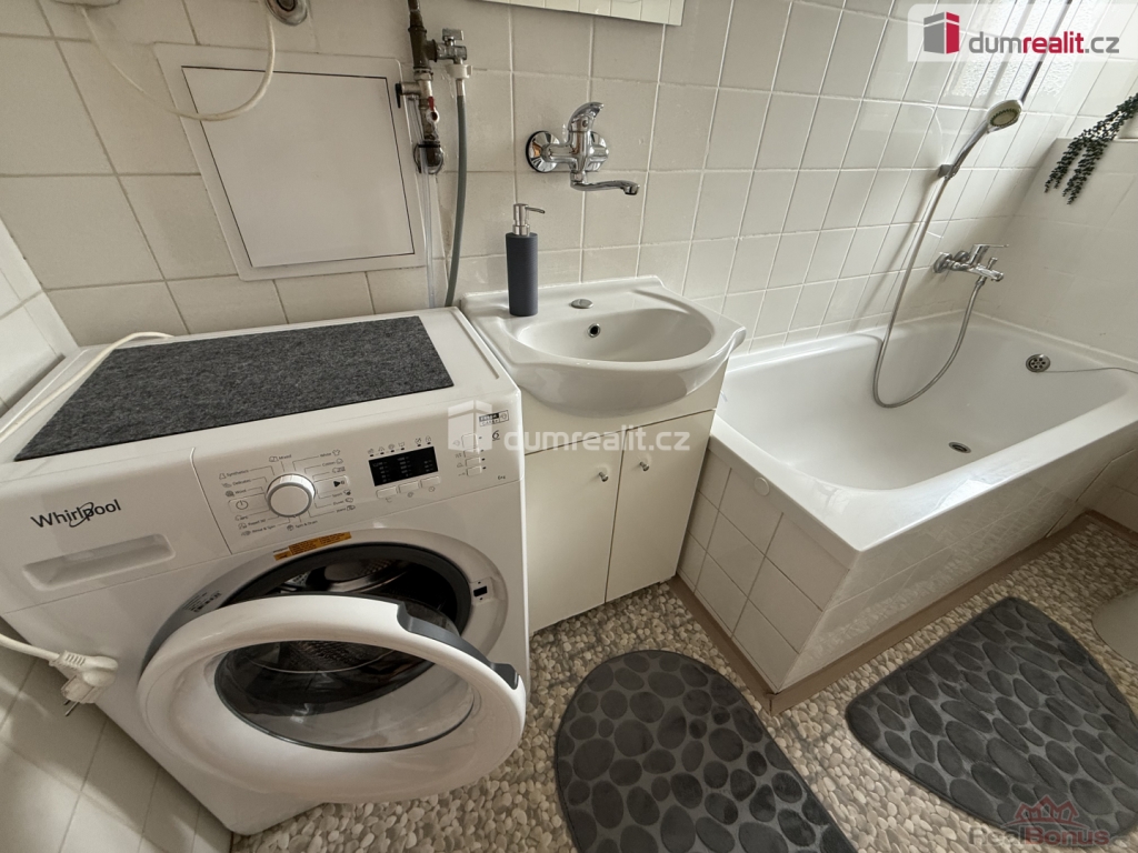 - Koupelna s vanou, skříňkou s umyvadlem, automatickou pračkou - společná s WC.