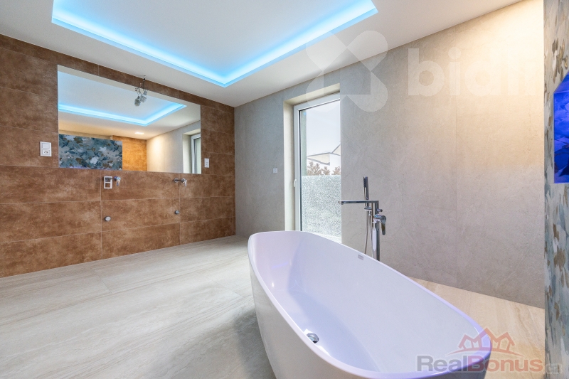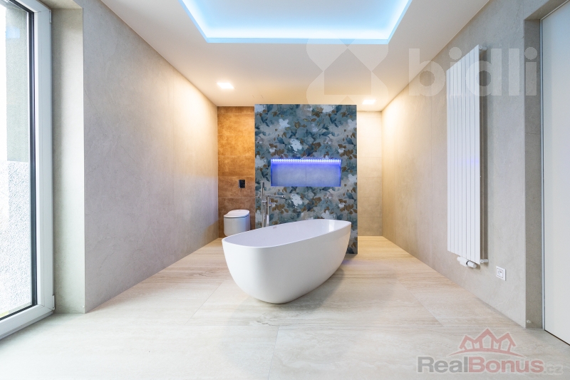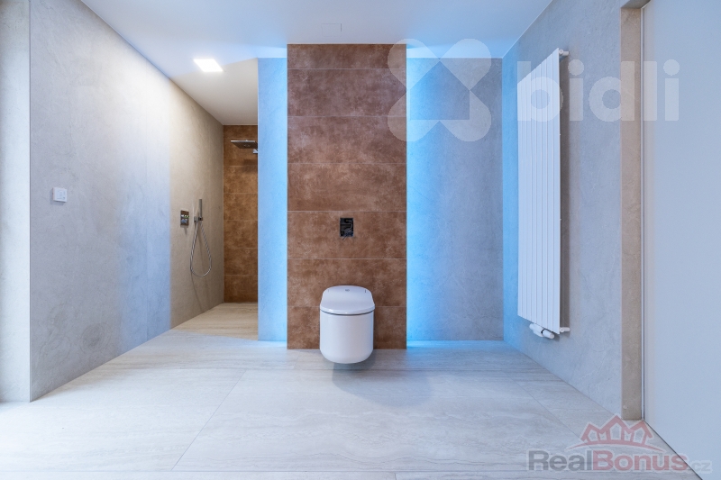 Dominantou suterénu je garáž o rozloze přes 100 m2, která pohodlně pojme čtyři automobily a motocykly. Výhodou garáže je i možnost dobíjení elektronických aut. Na ni navazuje špičková technická místnost. O mimořádně úsporný chod domu se stará tepelné čerpadlo systému země-vzduch a nadstandardní fotovoltaická elektrárna s výkonem 18 kWp s bateriovým úložištěm. V celém domě je instalováno podlahové vytápění. Unikátním prvkem je soukromý výtah, který vás vyveze ze suterénu přímo do obytných pater.