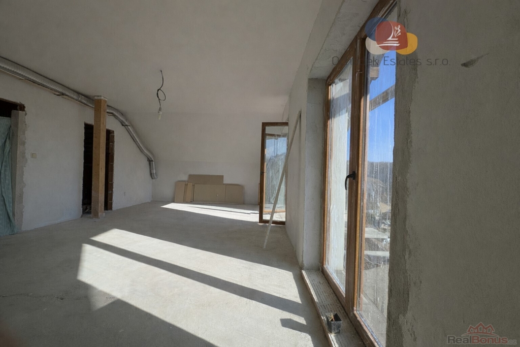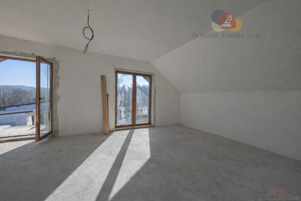 Na pozemku se nachází dvoupodlažní rodinný dům o podlahové ploše cca 162 m2, jehož druhé podlaží čeká na dokončení. V prvním podlaží najdeme obývací místnost propojenou s prostornou kuchyní a samostatnou koupelnu.