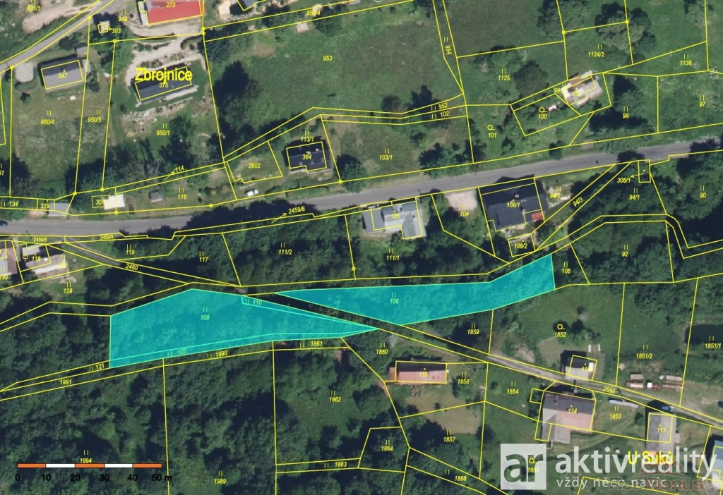 Na prodej je soubor složený ze čtyř pozemků (č.106+107+108+110) o celková výměře 2 158 m2, z toho zastavitelná část činí cca 410 m2 (plocha RI Z139) s maximálním koeficientem zastavění 0,15 ? to znamená, že na pozemku je možné postavit stavbu o maximální zastavěné ploše cca 61,5 m2 (maximální výška 1 nadzemní podlaží s možností podsklepení a obytného podkroví ? celkem tedy cca 100 m2 užitné plochy).