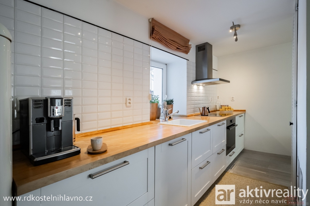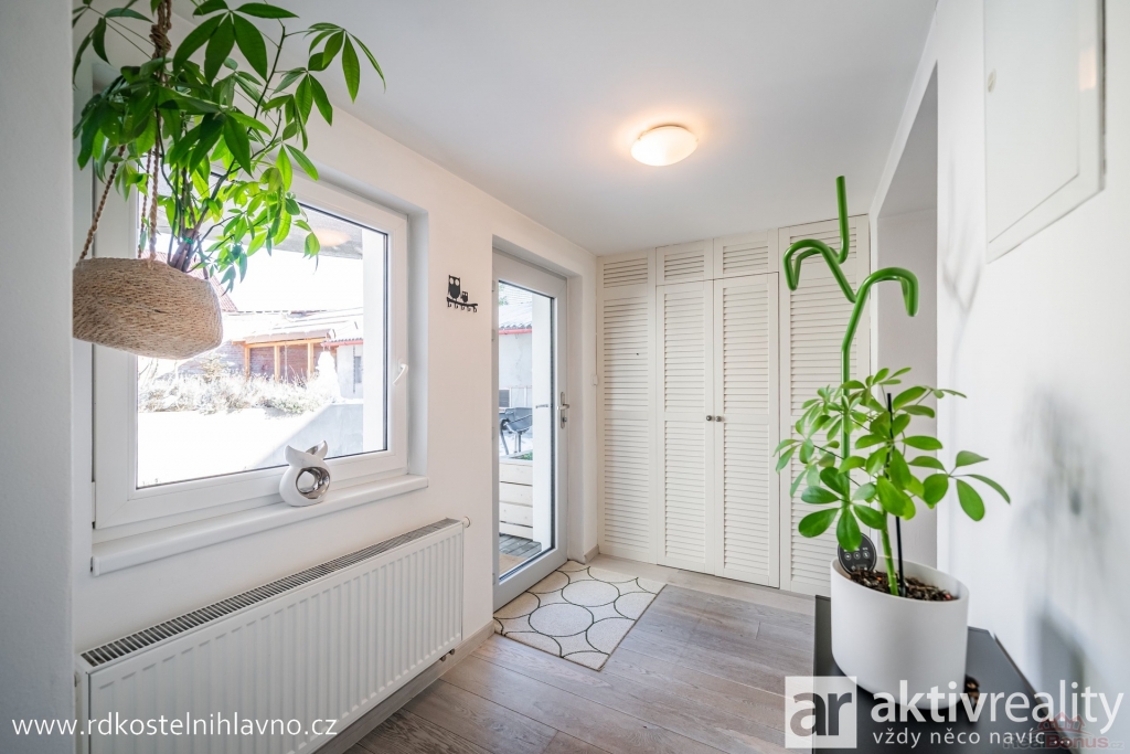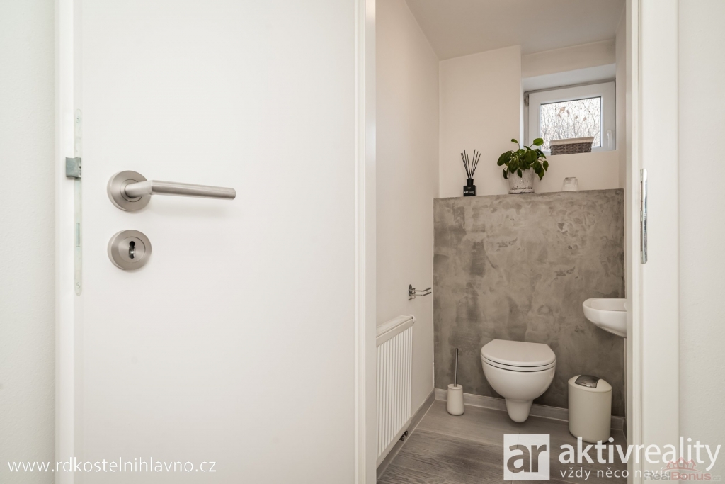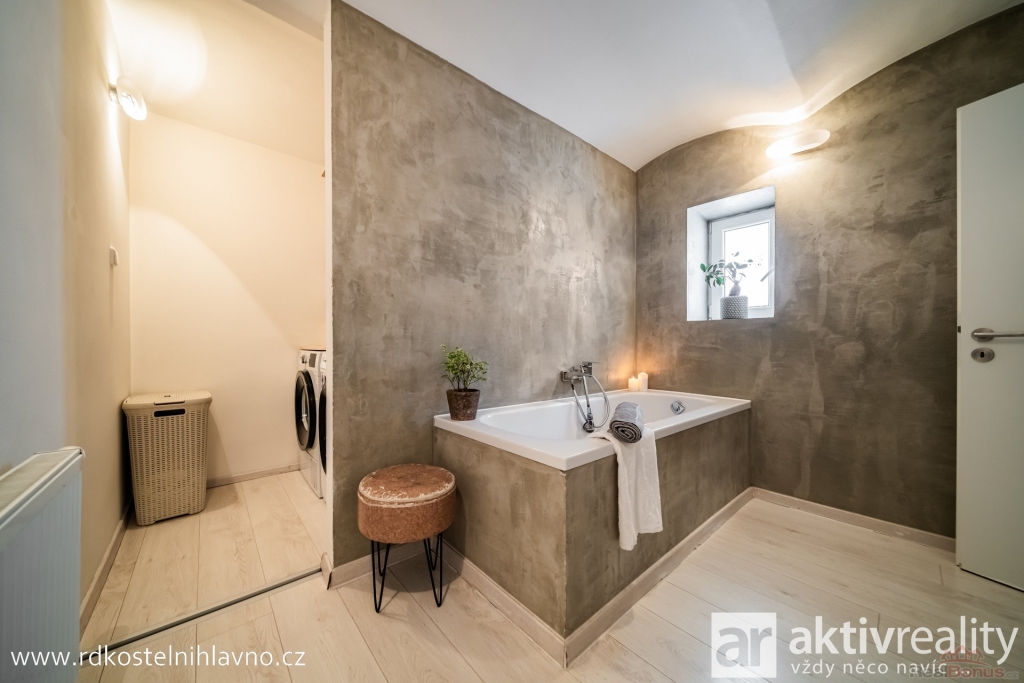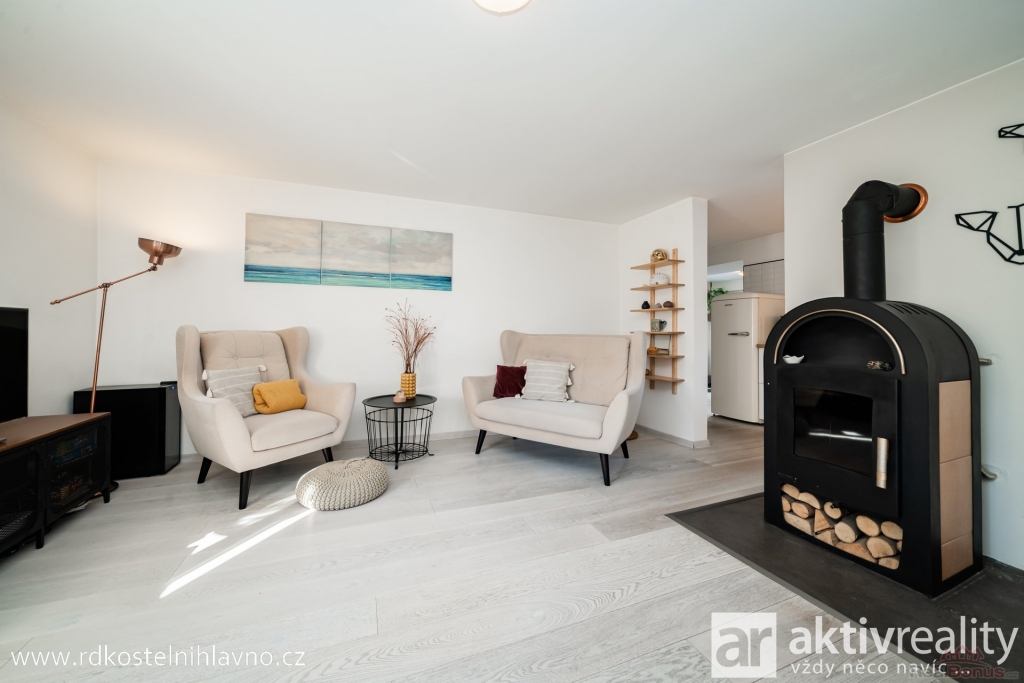 V přízemí vás přivítá světlá a prostorná vstupní chodba se skrytou šatnou, která nabízí dostatek úložného prostoru. Z chodby se dostanete do hlavní obytné části ? kuchyně, která je vybavena vestavěnými spotřebiči a prakticky oddělena od obývacího pokoje komínem s krbem. Dále je zde ložnice a další pokoj, který lze využít například jako dětský nebo pracovní. Koupelna je laděná do moderního stylu, s designovou betonovou stěrkou, která je téměř bezúdržbová, a vedle ní se nachází samostatná toaleta.