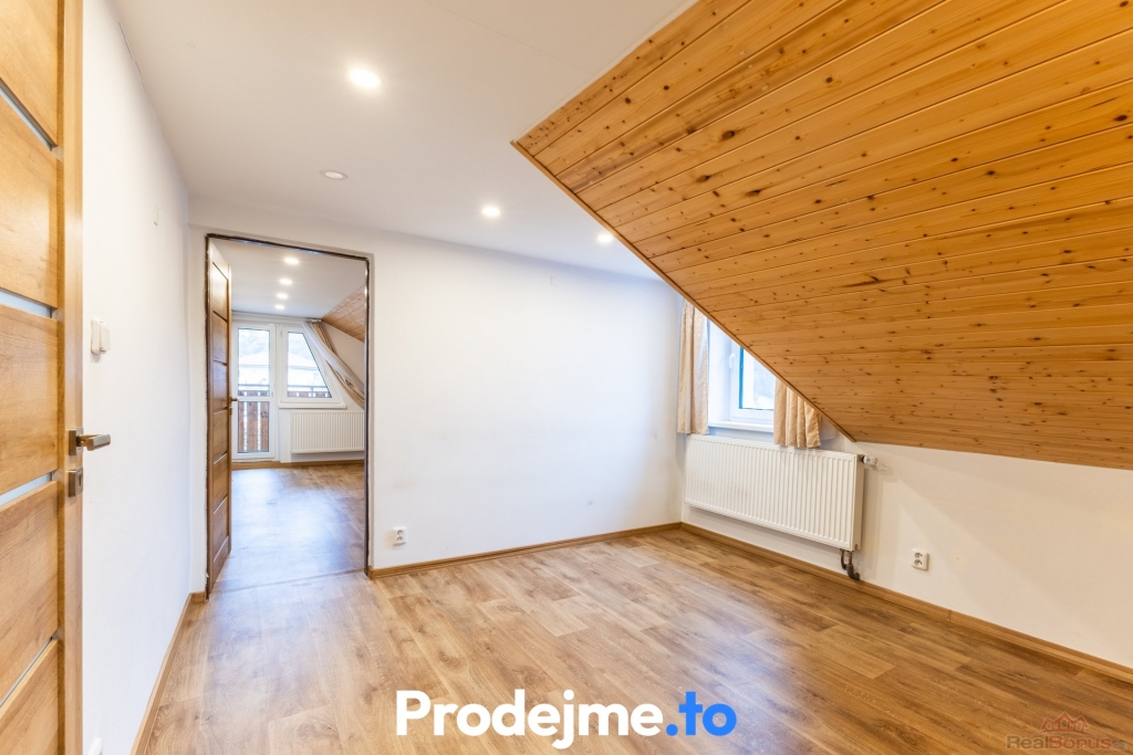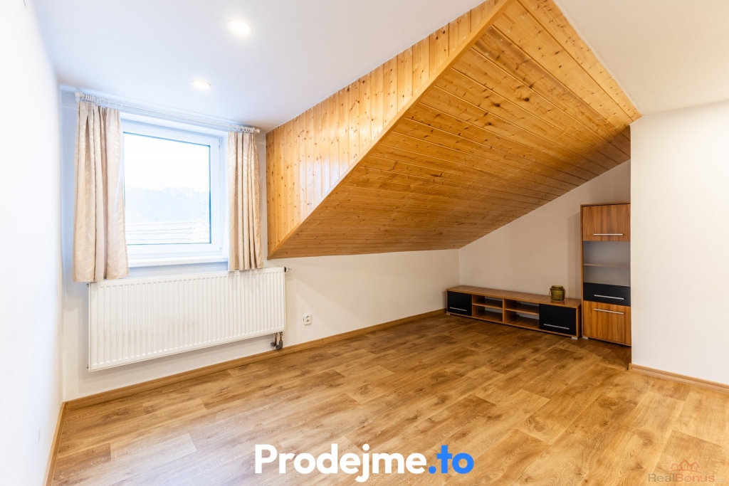 Podkroví bylo upraveno k bydlení a nabízí dispozici 2+1 o velikosti 70 m2. Najdete zde kuchyni, obývací pokoj se vstupem na lodžii, ložnici, samostatnou toaletu a vstupní chodbu s atypicky řešeným sprchovým koutem v rohu místnosti. Pro plnohodnotné dvougenerační bydlení bude vhodné zde doplnit samostatnou koupelnu. Součástí obytného podkroví je také půda, která poslouží především jako úložný prostor.