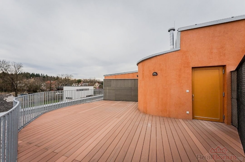 Byt disponuje obývacím pokojem propojeným s kuchyní. Ta je vybavenou kuchyňskou linkou, na kterou navazuje spižírna a sklad na přístroje. Z obývacího pokoje je přístupná lodžie a po točitých schodech také terasa na střeše bytu. Na terase se nachází komora pro skladování věcí z terasy. Na obývací pokoj navazuje chodba k ložnicím. Dvě menší vhodné jako dětské pokoje nebo pracovna a jedna hlavní ložnice s šatnou a vlastní koupelnou vybavenou sprchovým koutem a toaletou. K dispozici je dále společná koupelna s vanou a toaletou, dále prádelna s pračkou a sušičkou a komora s druhou lednicí. U vstupu se pak nachází prosklená předsíň, na kterou navazuje samostatná toaleta. Vně bytu na společné chodbě se pak nachází sklep. K dispozici je i společná kolárna.