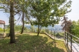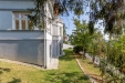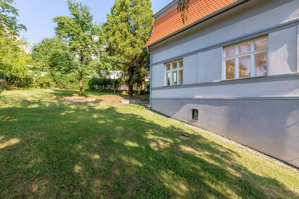 Na zahradě je několik starších stromů, kamenné zídky, starší dřevěný zahradní domek.