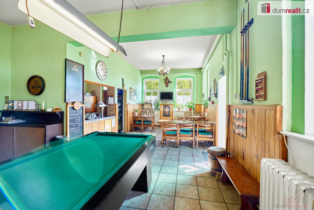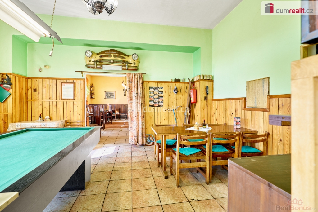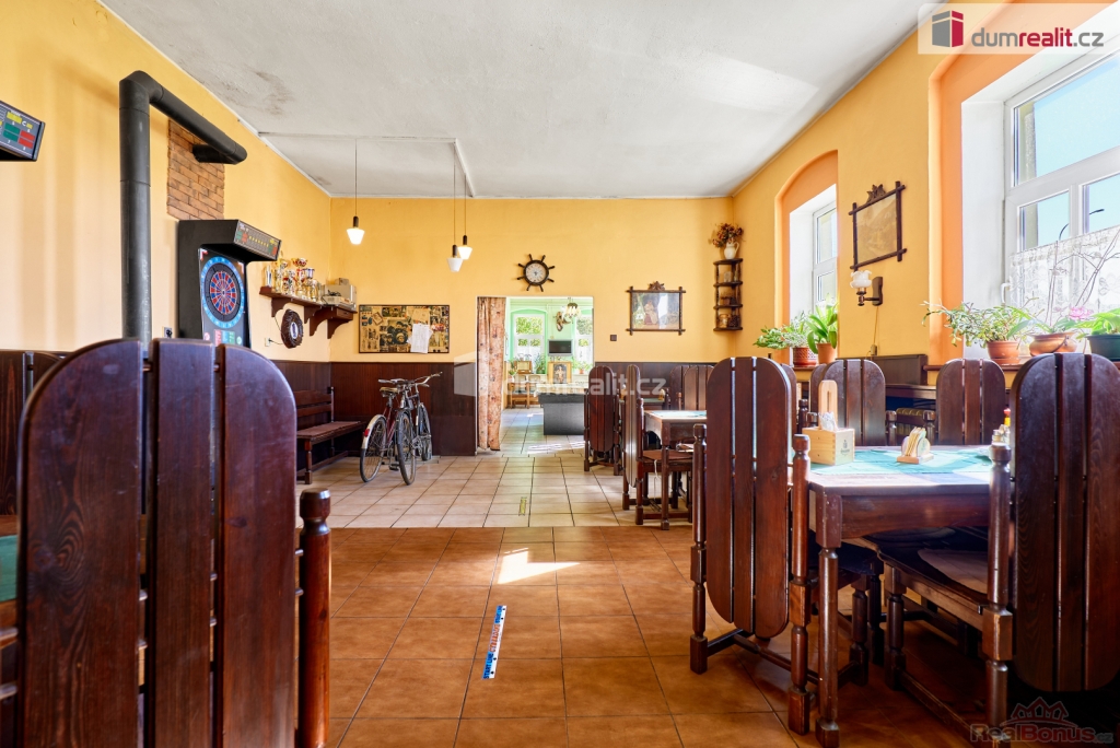 vč. právního servisu a provize RK, Dumrealit.cz Vám zprostředkuje prodej zavedené a oblíbené restaurace s penzionem "Rafanda" v obci Hroznětín na úpatí Krušných hor. V přízemí objektu je restaurace (25 míst) a salonek (35 míst), výčep, kuchyně, sklady, WC a kotelna, ve které je umístěn plynový kotel a el. bojlery. V prostoru restaurace jsou krbová kamna s výměníkem. V 1. patře jsou 4 pokoje s celkem 11 lůžky, společné sociální zařízení (WC a sprchy) a kuchyňský kout. V podkroví je byt 2+1. Sklep je využíván jako sklad nápojů. Na zahradě je venkovní posezení se 60 místy a samovýčep pro cyklisty a turisty. Budova je zateplená, na části je nová střecha. Objekt leží na hlavním silničním tahu do Krušných hor, v těsné blízkosti cyklostezky, která je součástí místní široké sítě cyklistických, turistických a běžeckých tras, vlakové a autobusové stanice. V obci je všechna potřebná občanská vybavenost. Možnost investičně využít jako ubytovnu pro zaměstnance s vlastní jídelnou. Koupě je možná i kombinací s jinou nemovitostí. Ev. číslo: 647398. Energetický štítek: G