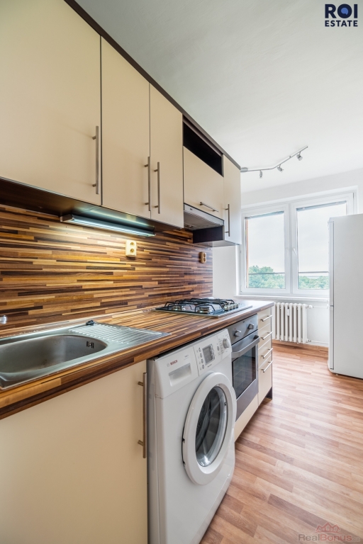 Po vstupu do bytu se ocitnete na poměrně prostorné chodbě, odkud se dostanete jak do koupelny se sprchovým koutem a toaletou, tak do kuchyně či pokoje. Kuchyň s jídelnou disponuje kromě moderní linky i kombinovanou lednicí a pračkou zasazenou do linky. Do pokoje bez problémů vměstnáte postel i sedací soupravu. S úložným prostorem si taky nemusíte dělat starosti, protože zde pro vás máme i šatní skříň.