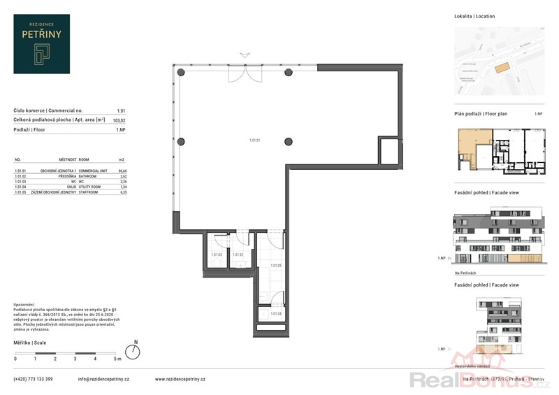 Disp.: obchodní jednotka 86,66 m2, předsíňka 2,62 m2, WC 2,26 m2, úklid 1,34 m2, zázemí obchodní jednotky 6,35 m2. Celková plocha: 103,02 m2.