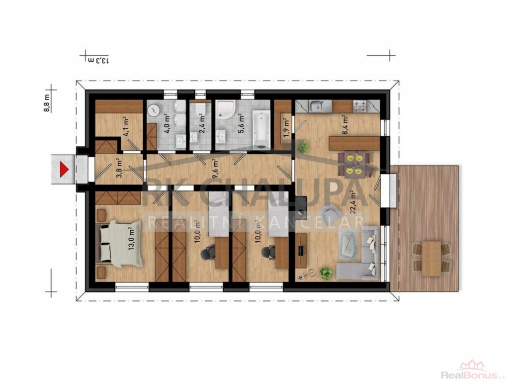 Nabízíme zajištění výstavby zděného domu, bungalovu, en. třídy B, na vašem pozemku pro lokalitu České Budějovice a okolí do cca 20 km. Dům o dispozici 4+kk, zastavěná plocha 114 m2, tj. vstup do zádveří, za kterým je situována komunikační chodba se vstupy do jednotlivých místností: jídelna, kuchyně se spíží, obývací pokoj, ložnice, dva dětské pokoje, koupelna, WC, technická místnost. V obývacím pokoji komín pro krb, francouzské okno umožňující pohodlný vstup na terasu, případně na zahradu. V chodbě je výlez na půdu, k úložnému prostoru, pochozí stav. Okna v provedení trojsklo. Součástí ceny i kompletní projektová dokumentace, vyřízení st. povolení a ohlášení. Domy předáváme po řádné kolaudaci - souhlasu s užíváním. Cena uváděná bez hodnoty pozemku. V případě topného systému elektrokotlem sleva 30.000 Kč. Vyztužení vazníků k přípravě fotovoltaiky možné. Zajistíme Vám prezentaci typových domů. Zrealizujeme i Váš individuální projekt. Videoprohlídky zhlédnete na našich webových stránkách.