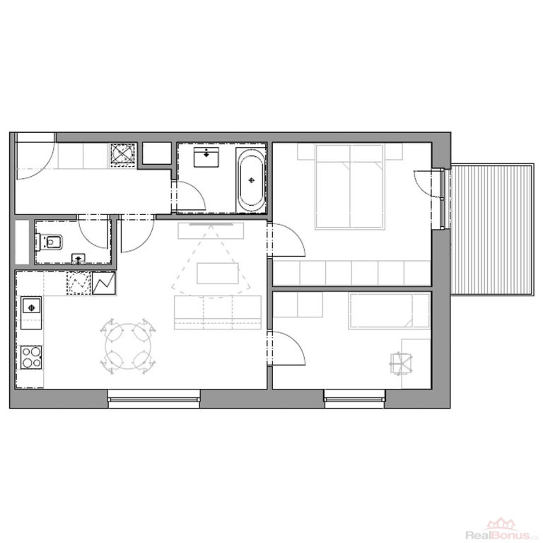 Dispozice bytu: chodba (6,1 m2), obývací pokoj s kuchyňským koutem (22,2 m2), pokoj (13,6 m2), pokoj (9,2 m2), koupelna (3,6 m2), WC (2,0 m2), balkon (6,0 m2), sklep (3,5 m2)
